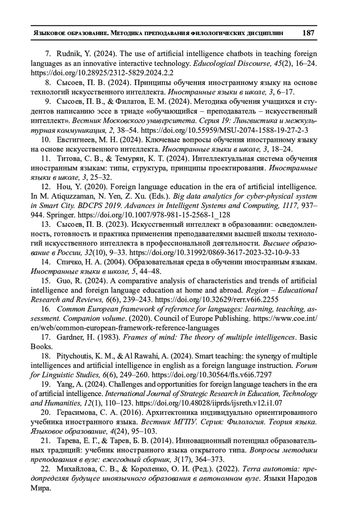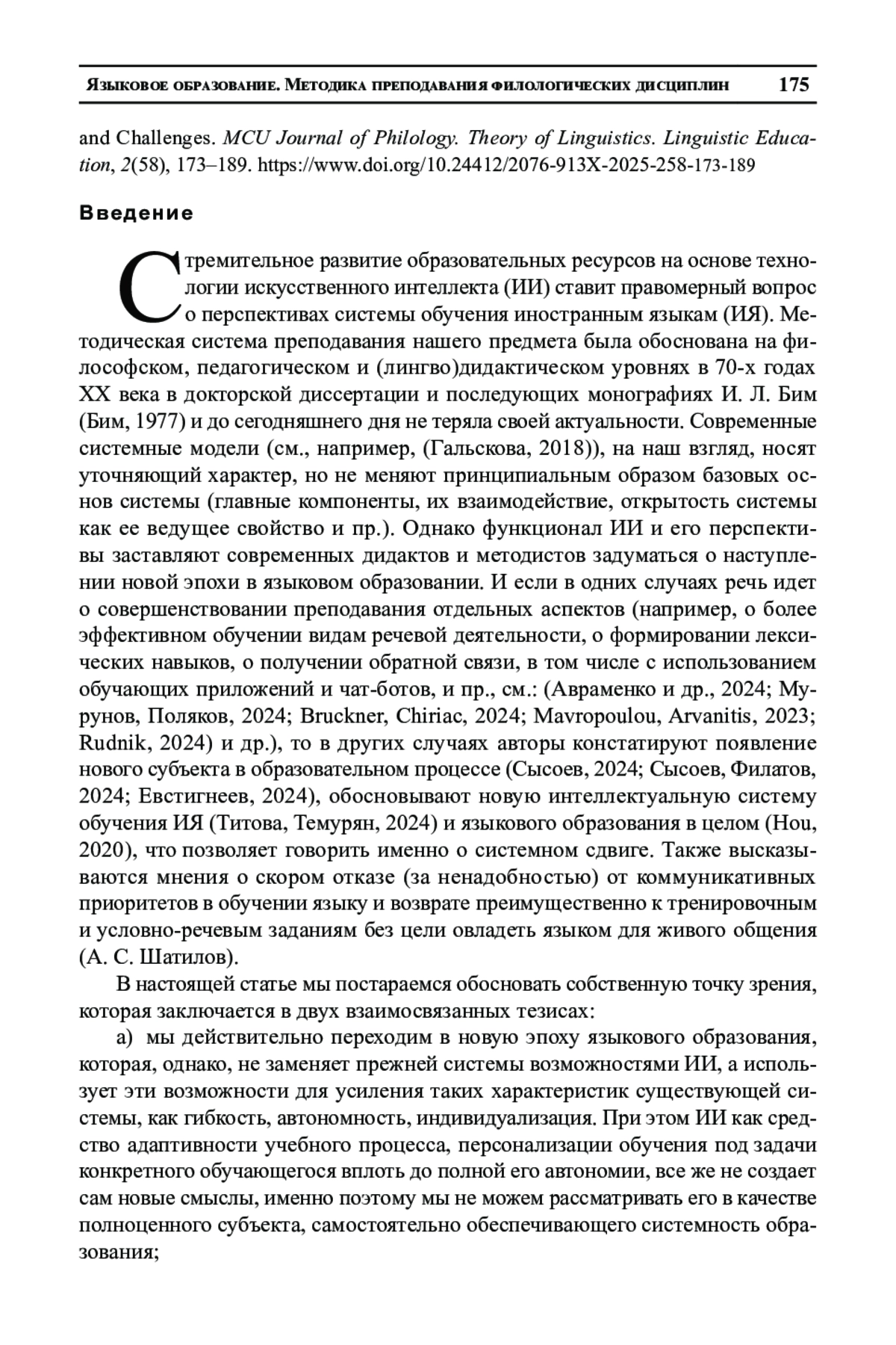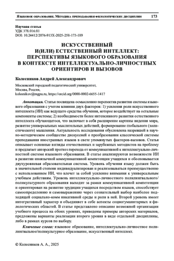 Статья: ИСКУССТВЕННЫЙ И(ИЛИ) ЕСТЕСТВЕННЫЙ ИНТЕЛЛЕКТ: ПЕРСПЕКТИВЫ ЯЗЫКОВОГО ОБРАЗОВАНИЯ В КОНТЕКСТЕ ИНТЕЛЛЕКТУАЛЬНО-ЛИЧНОСТНЫХ ОРИЕНТИРОВ И ВЫЗОВОВ (2025)