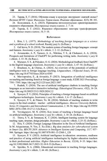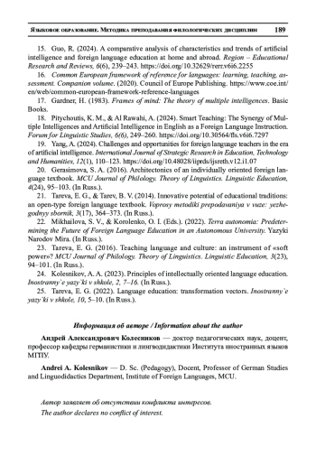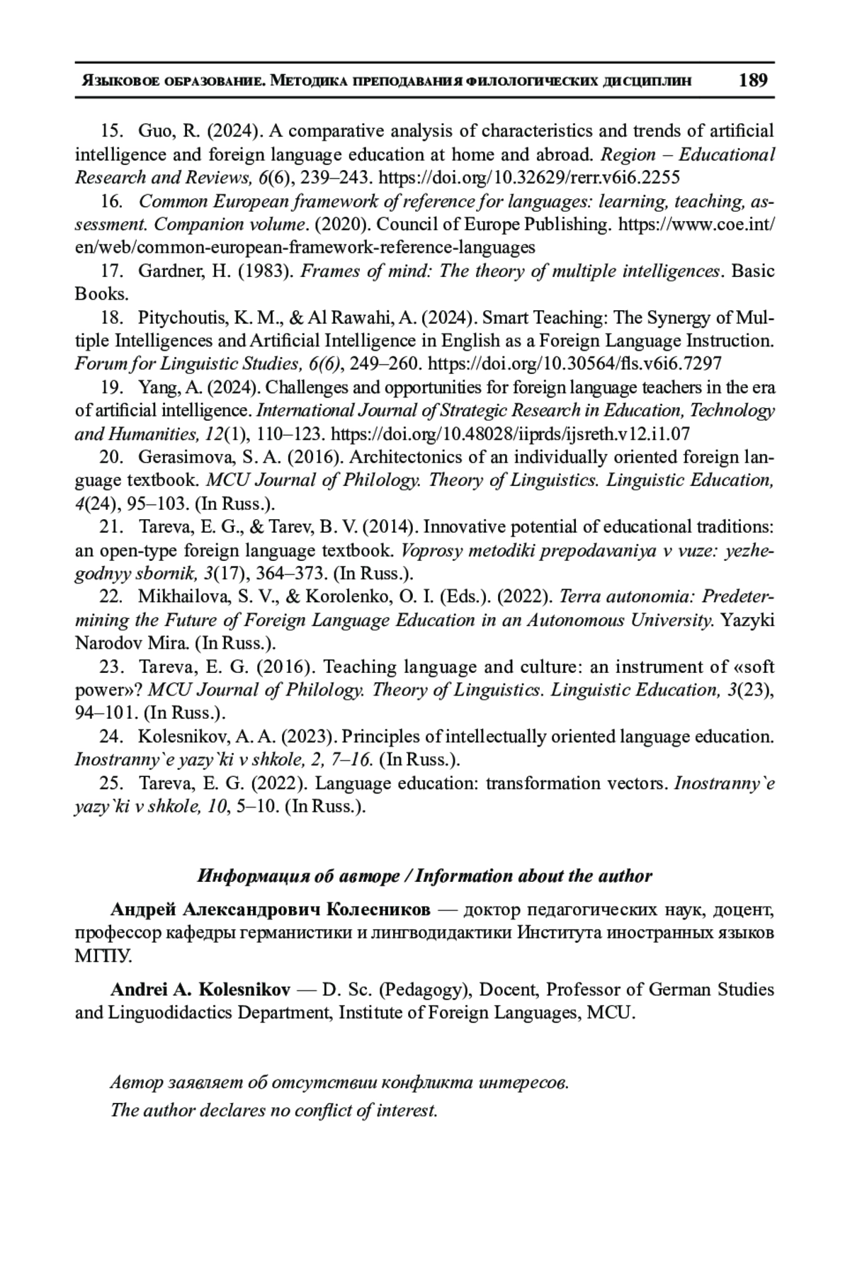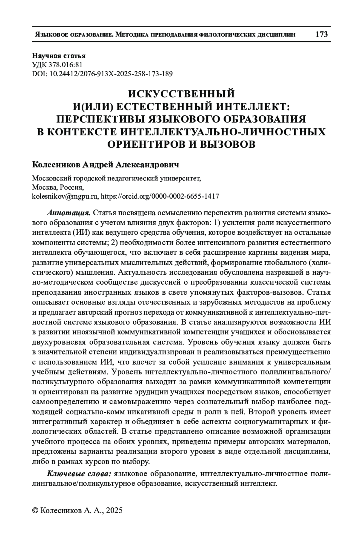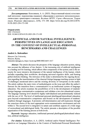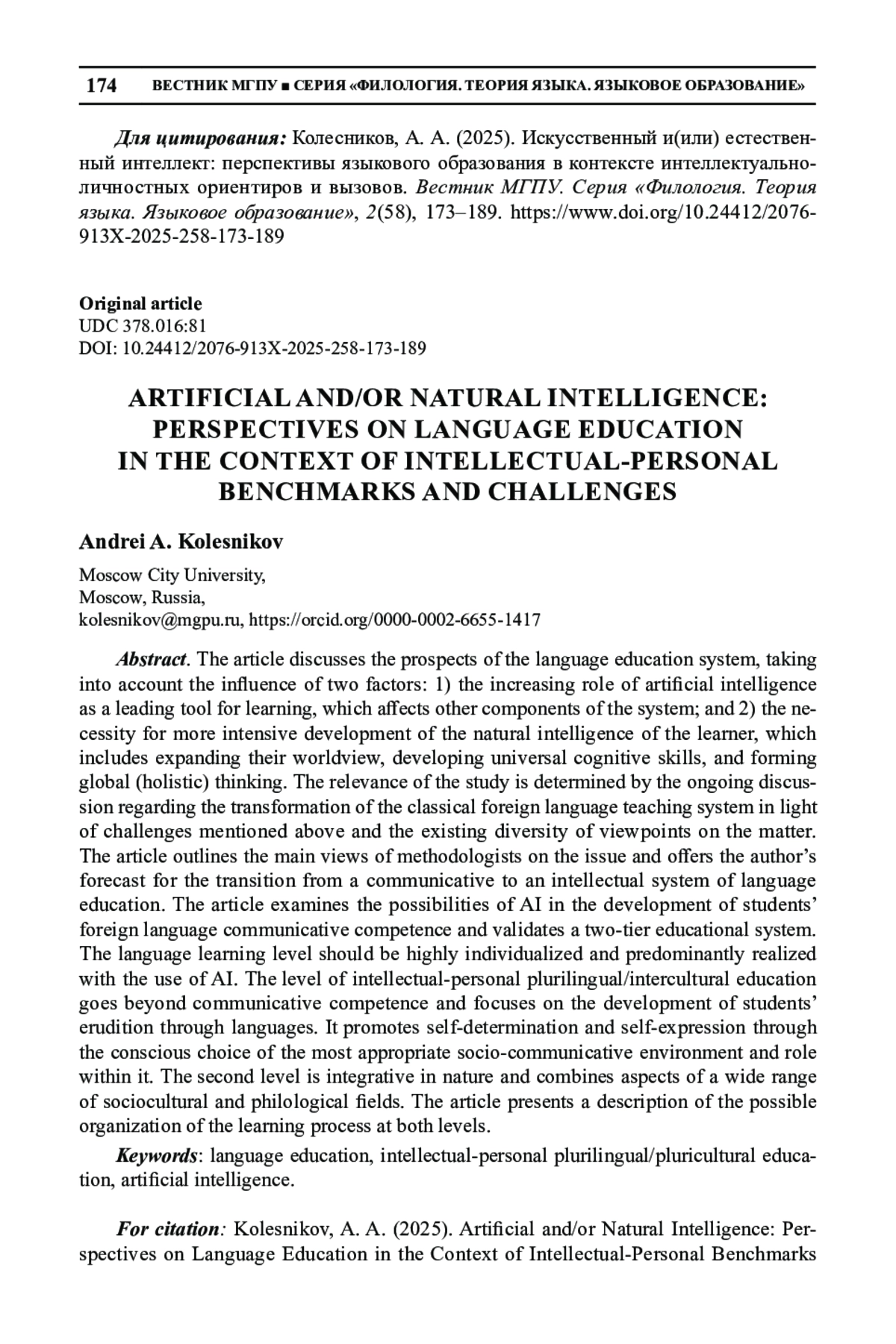 КОЛЕСНИКОВ А. А. ИСКУССТВЕННЫЙ И(ИЛИ) ЕСТЕСТВЕННЫЙ ИНТЕЛЛЕКТ: ПЕРСПЕКТИВЫ ЯЗЫКОВОГО ОБРАЗОВАНИЯ В КОНТЕКСТЕ ИНТЕЛЛЕКТУАЛЬНО-ЛИЧНОСТНЫХ ОРИЕНТИРОВ И ВЫЗОВОВ // ВЕСТНИК МГПУ. СЕРИЯ: ФИЛОЛОГИЯ. ТЕОРИЯ ЯЗЫКА. ЯЗЫКОВОЕ ОБРАЗОВАНИЕ. 2025. № 2 (58)