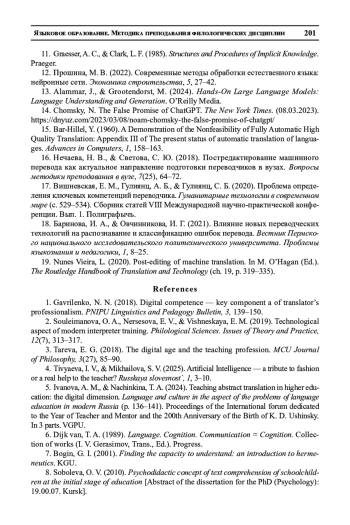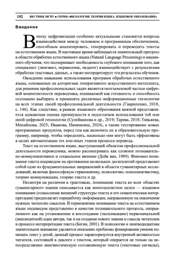 Статья посвящена вопросам, связанным с обработкой естественного языка при помощи программ, основанных на алгоритмах генеративного искусственного интеллекта. Авторы анализируют процесс письменного перевода с применением программных продуктов, способствующих его автоматизации, с точки зрения обучения будущих переводчиков, развития у них цифровой компетентности и готовности осознанно выбирать и применять различные информационные технологии на всех этапах своей профессиональной деятельности. В работе описывается феномен понимания текста и его различные трактовки с позиций герменевтики, психологии, лингводидактики, когнитивной и компьютерной лингвистики. Авторы анализируют причины, приводящие к ошибкам студентов-переводчиков при постредактировании результатов машинного перевода с использованием систем нейронного машинного перевода (НМП) и больших лингвистических моделей (Large Language Models (LLM)). В работе применены теоретические методы исследования (анализ и синтез, моделирование), а также сравнительно-сопоставительный метод, позволяющий интерпретировать эмпирический материал. Выявлена специфика машинного перевода в сопоставлении с традиционным профессиональным, которая заключается в отсутствии на сегодняшний день возможности полной интерпретации оригинального текста, связанного с фоновым, прагматическим, аксиологическим и прочими контекстами. Несмотря на то что системы нейронного машинного перевода в значительной степени автоматизируют работу с текстом, остается острая необходимость в постпереводческом редактировании, обучение которому выходит на первый план подготовки современных будущих переводчиков.