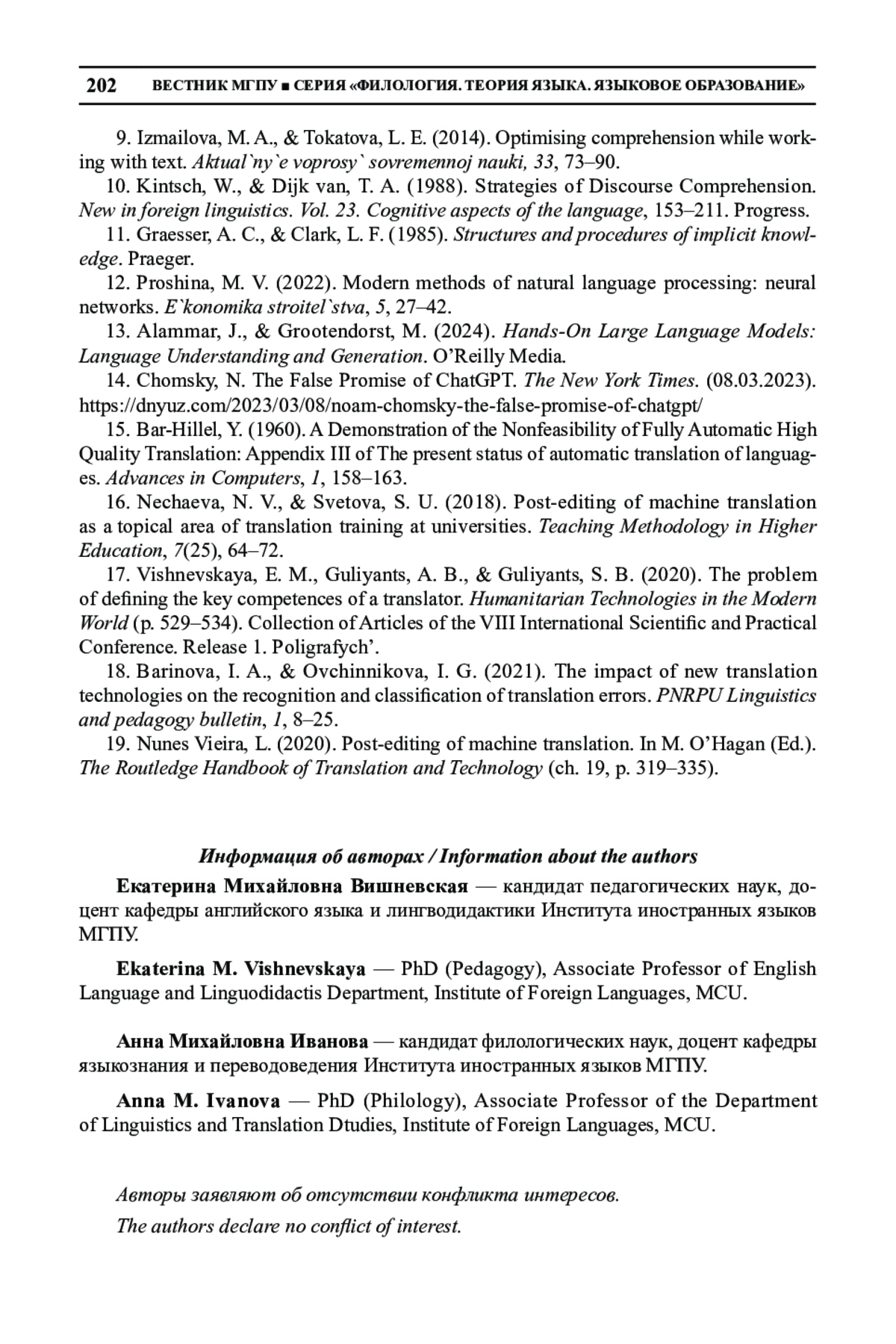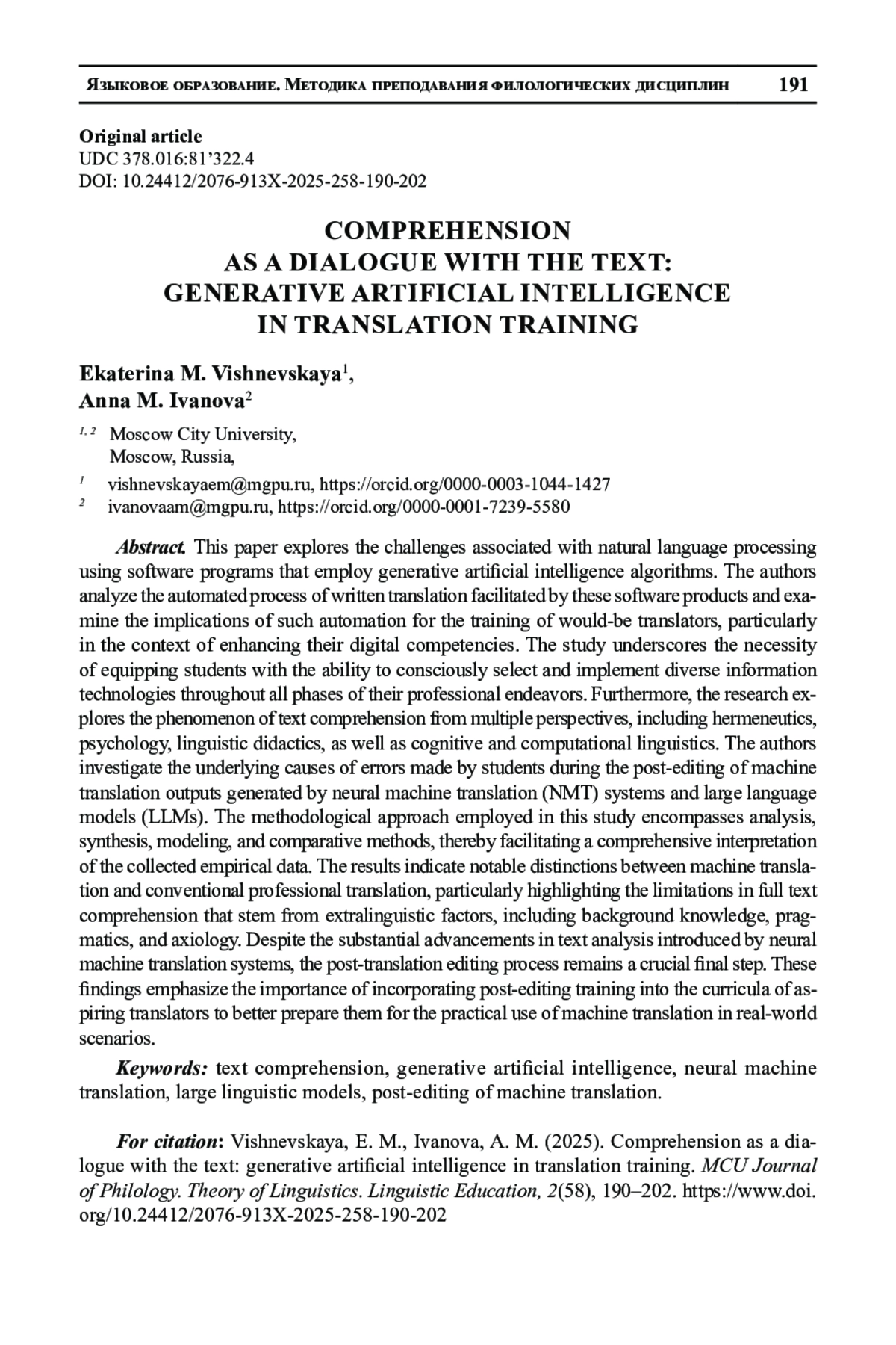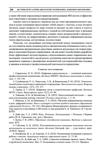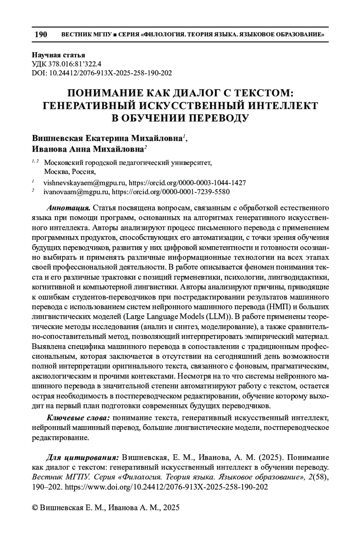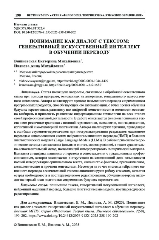 ИВАНОВА А. М., ВИШНЕВСКАЯ Е. М. ПОНИМАНИЕ КАК ДИАЛОГ С ТЕКСТОМ: ГЕНЕРАТИВНЫЙ ИСКУССТВЕННЫЙ ИНТЕЛЛЕКТ В ОБУЧЕНИИ ПЕРЕВОДУ // ВЕСТНИК МГПУ. СЕРИЯ: ФИЛОЛОГИЯ. ТЕОРИЯ ЯЗЫКА. ЯЗЫКОВОЕ ОБРАЗОВАНИЕ. 2025. № 2 (58)