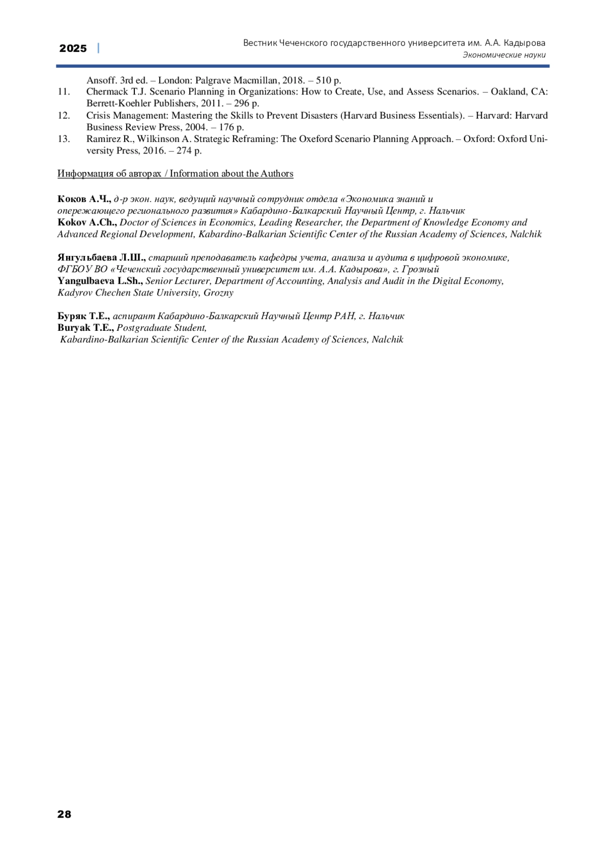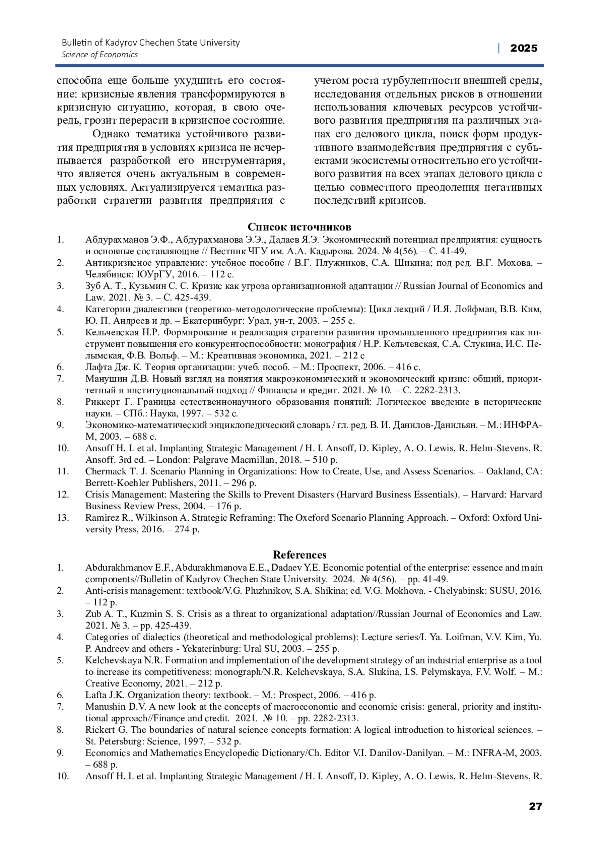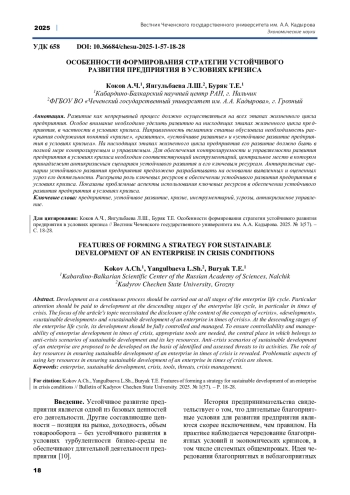 ЯНГУЛЬБАЕВА Л.Ш., БУРЯК Т.Е., КОКОВ А.Ч. ОСОБЕННОСТИ ФОРМИРОВАНИЯ СТРАТЕГИИ УСТОЙЧИВОГО РАЗВИТИЯ ПРЕДПРИЯТИЯ В УСЛОВИЯХ КРИЗИСА // ВЕСТНИК ЧЕЧЕНСКОГО ГОСУДАРСТВЕННОГО УНИВЕРСИТЕТА ИМ. А. А. КАДЫРОВА. 2025. № 1 (57)