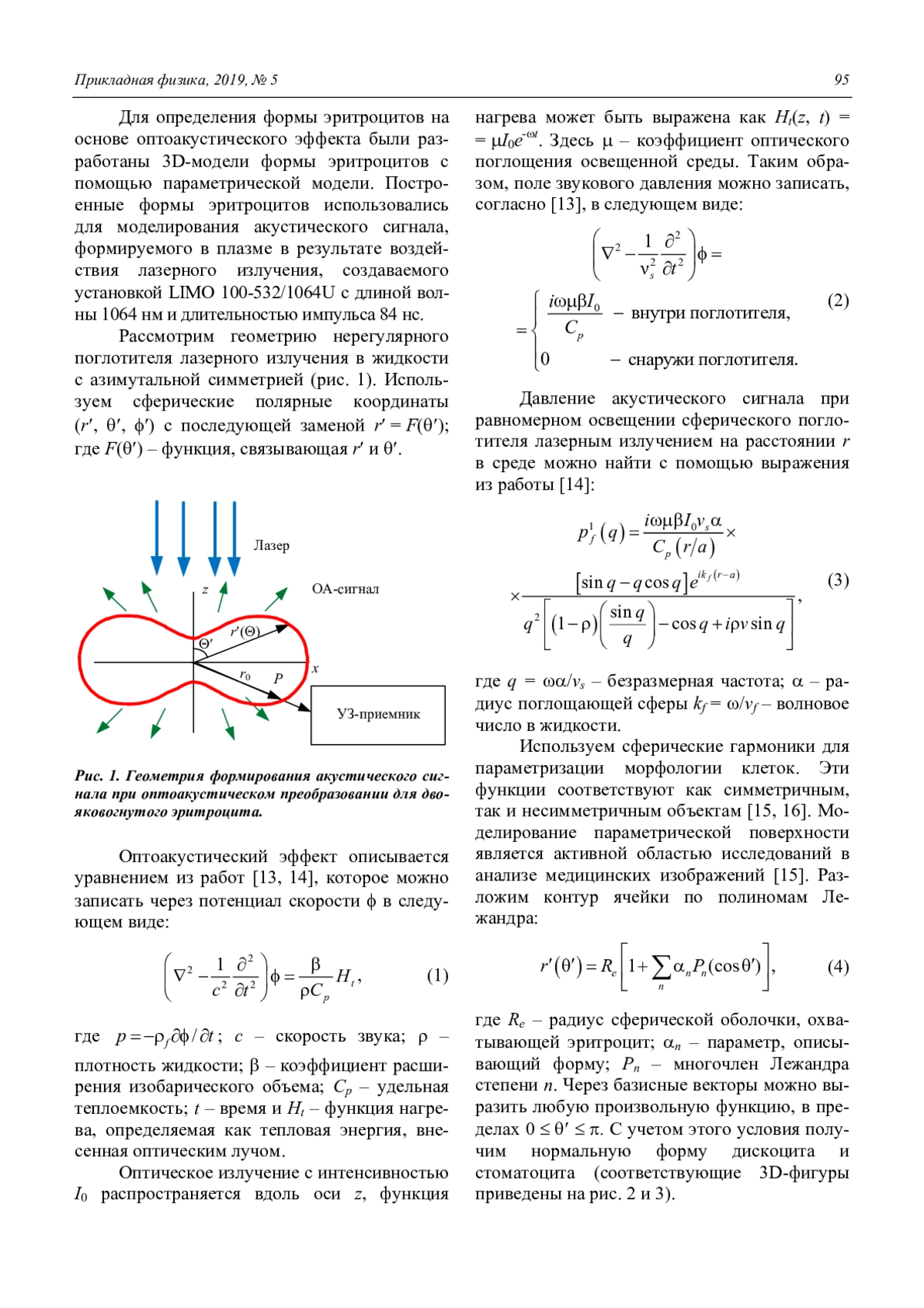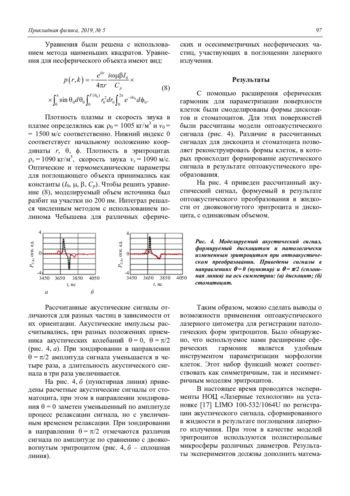 КРАВЧУК Д. А. МОДЕЛИРОВАНИЕ АКУСТИЧЕСКИХ СИГНАЛОВ ПРИ ОПТОАКУСТИЧЕСКОМ ЭФФЕКТЕ ДЛЯ ОБНАРУЖЕНИЯ ЭРИТРОЦИТОВ РАЗЛИЧНОЙ ФОРМЫ ЛАЗЕРНЫМ ЦИТОМЕТРОМ // ПРИКЛАДНАЯ ФИЗИКА. 2019. №5