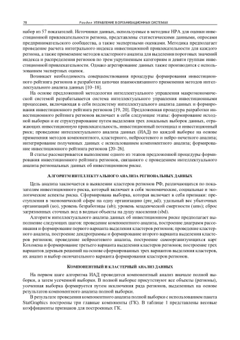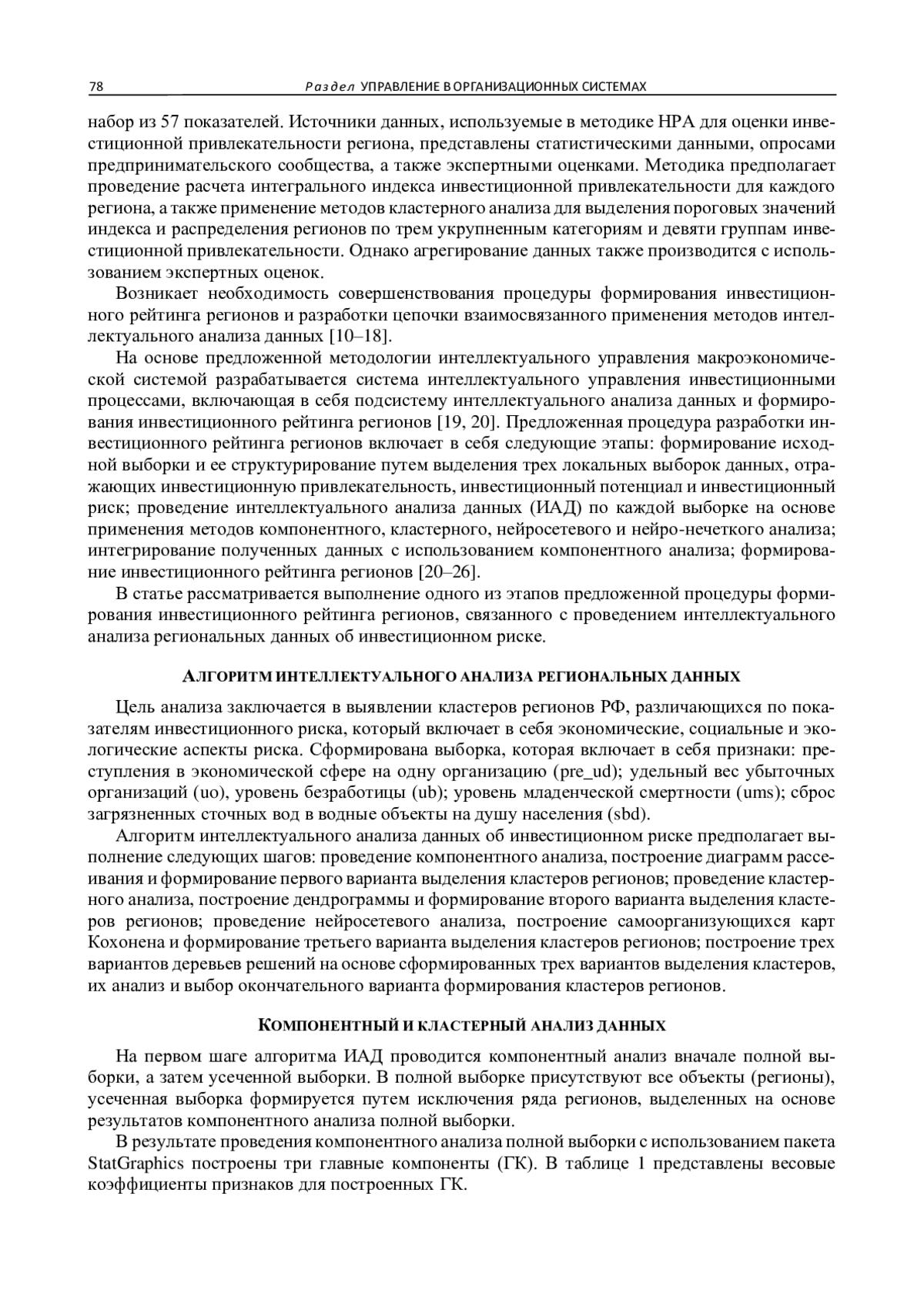 Решением проблем анализа инвестиционной привлекательности регионов и предприятий занимаются многие исследователи. Одной из задач анализа инвестиционной привлекательности является задача формирования инвестиционного рейтинга регионов, которая играет важную роль в стимулировании развития не только регионов, но и страны в целом. Формирование адекватной оценки инвестиционного рейтинга является важным фактором, который позволяет провести сравнение регионов по многим показателям, что необходимо для выявления проблемных областей в управлении государством или регионами и определения направлений их развития. Знание инвестиционного рейтинга позволяет, с одной стороны, мотивировать регионы к конкуренции за улучшение своих показателей, а с другой стороны, обеспечить информационную поддержку органам власти при определении приоритетов для развития регионов. В целом оценка инвестиционного рейтинга регионов имеет важное значение как с позиций государственных органов власти при принятии решений по распределению бюджетных ресурсов, так и с позиций частных инвесторов при принятии решений о размещении капитала [1–4].