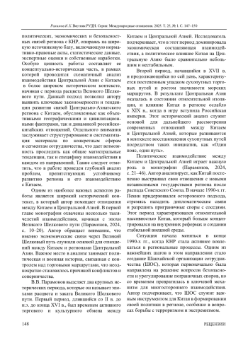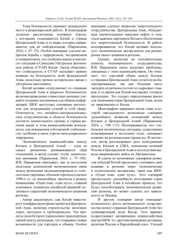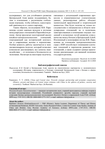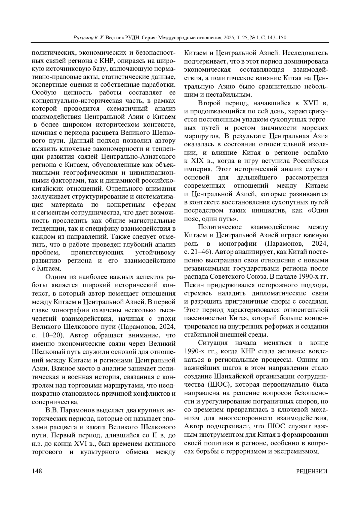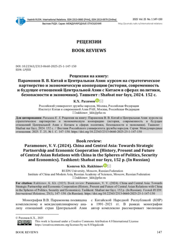 Рахимов К. Х. Рецензия на книгу: Парамонов В. В. Китай и Центральная Азия: курсом на стратегическое партнерство и экономическую кооперацию (история, современность и будущее отношений Центральной Азии с Китаем в сферах политики, безопасности и экономики). Ташкент: Shafoat nur fayz, 2024. 152 с. // Вестник Российского университета дружбы народов. Серия: Международные отношения. 2025. Т. 25, № 1. С. 147–150. https://doi. org/10.22363/2313-0660-2025-25-1-147-150