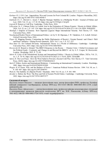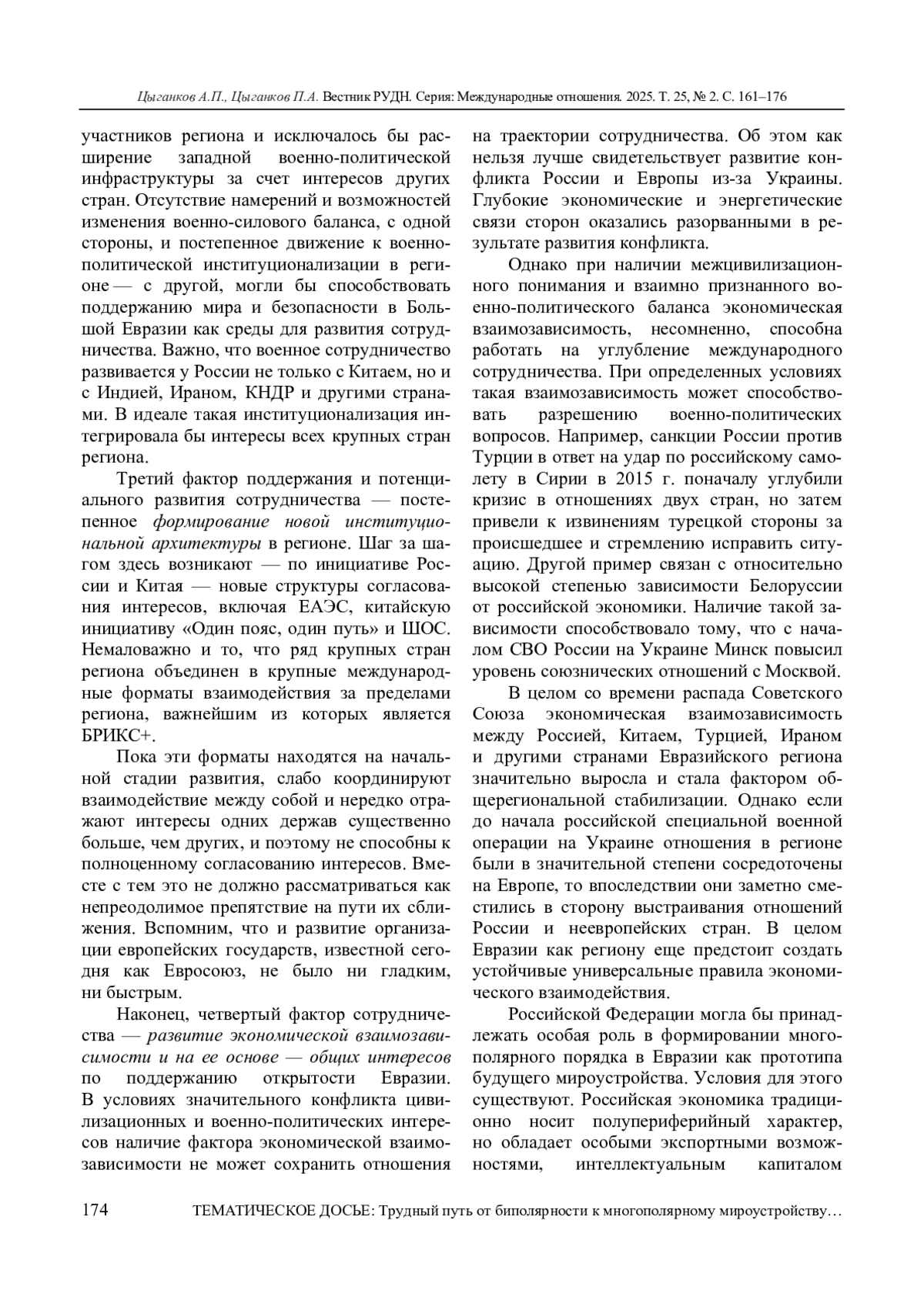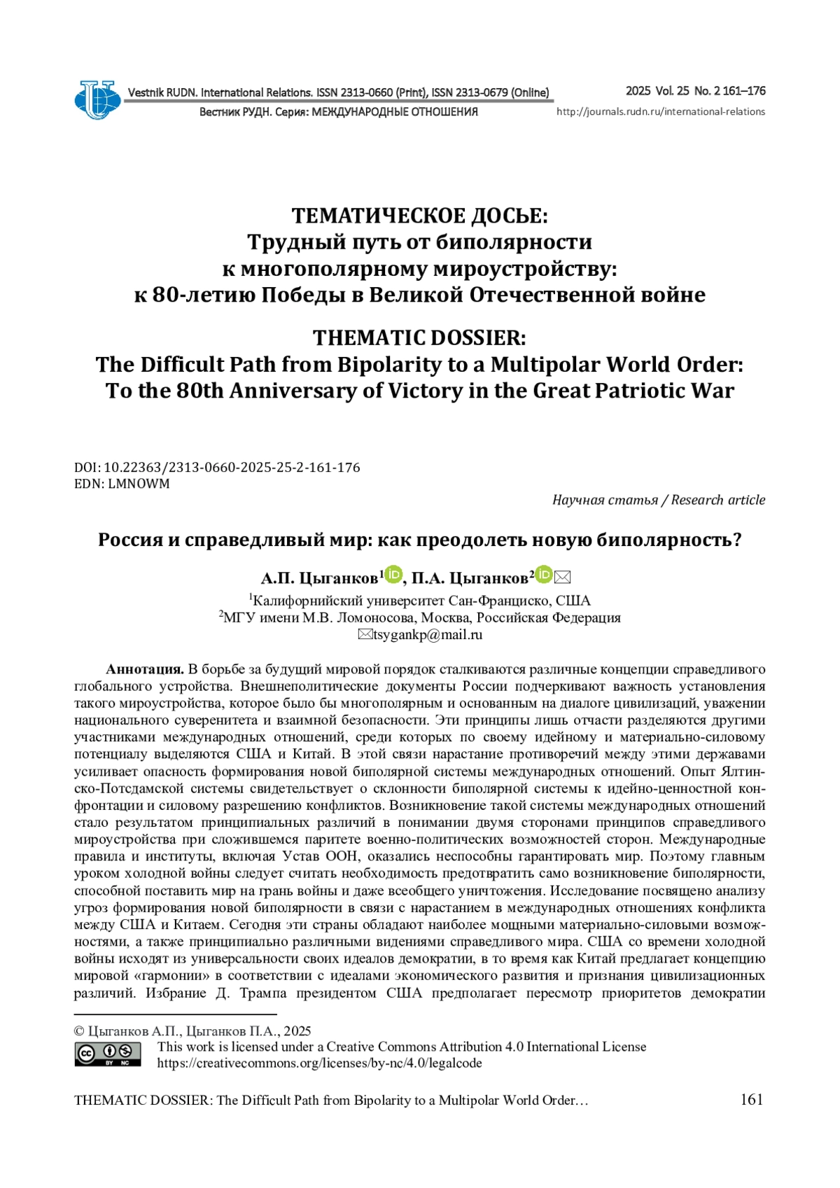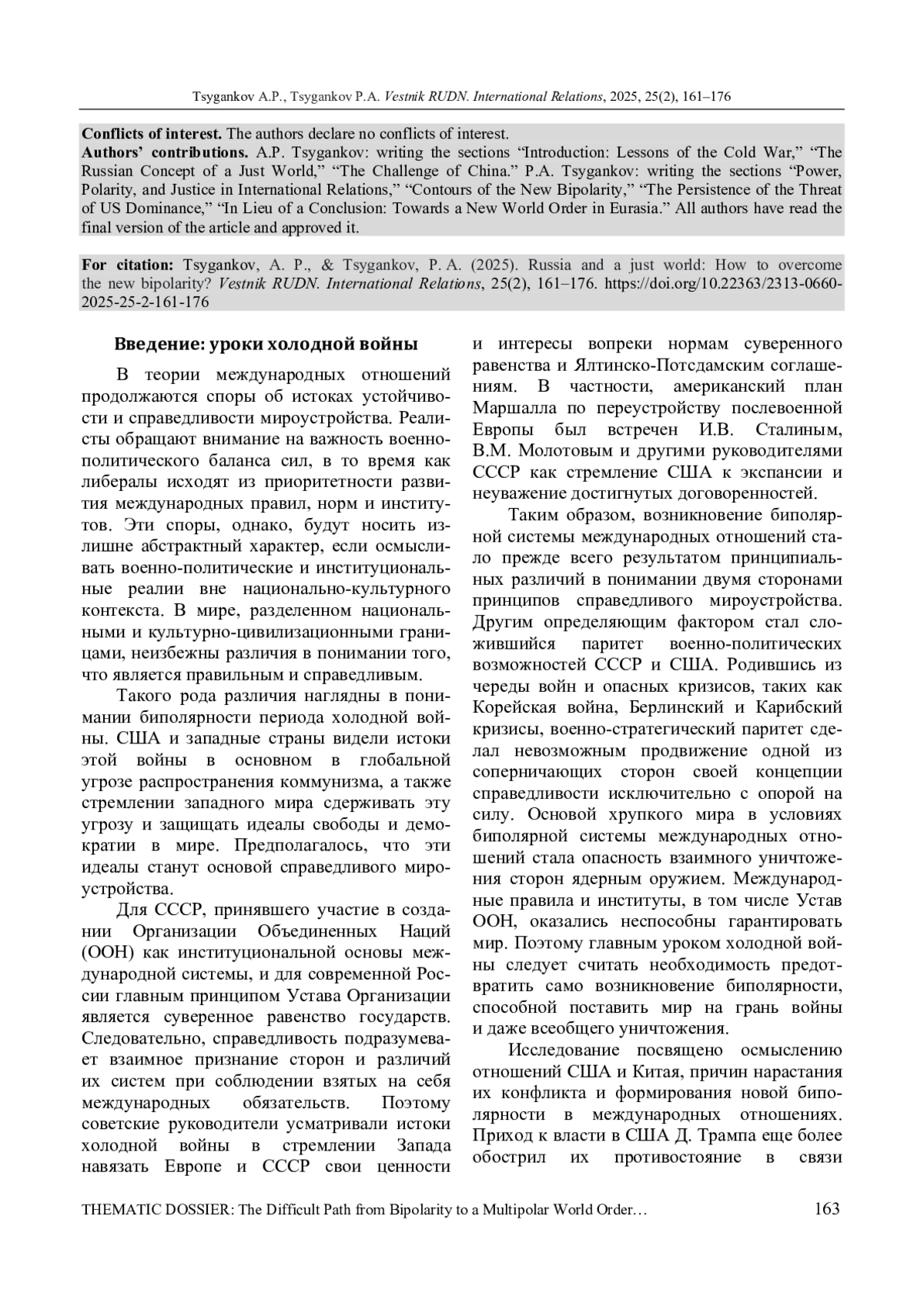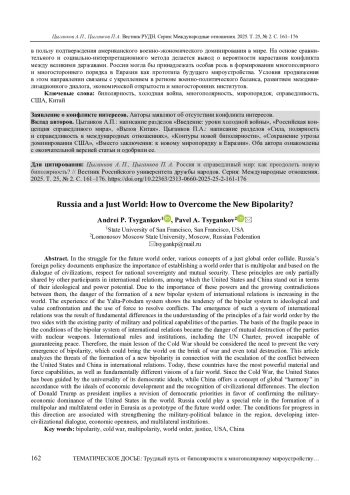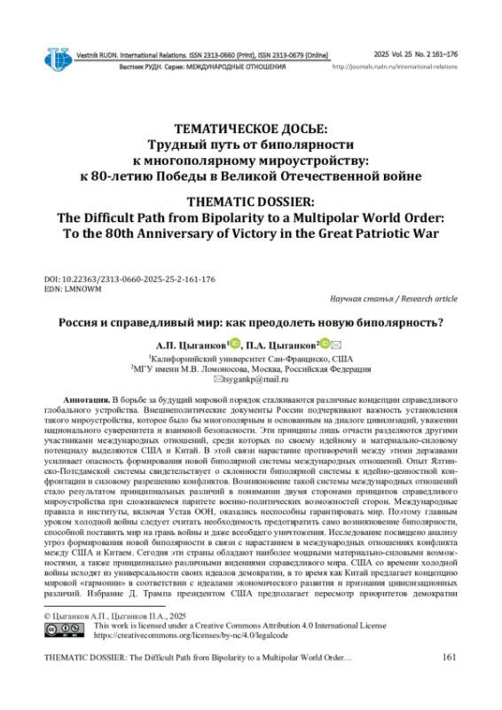 ЦЫГАНКОВ А. П., ЦЫГАНКОВ П. А. РОССИЯ И СПРАВЕДЛИВЫЙ МИР: КАК ПРЕОДОЛЕТЬ НОВУЮ БИПОЛЯРНОСТЬ? // ВЕСТНИК РОССИЙСКОГО УНИВЕРСИТЕТА ДРУЖБЫ НАРОДОВ. СЕРИЯ: МЕЖДУНАРОДНЫЕ ОТНОШЕНИЯ. 2025. ТОМ 25 № 2