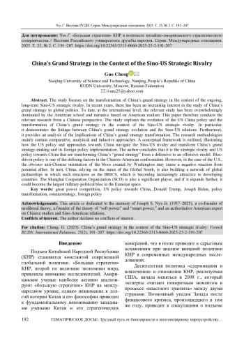 Рассмотрена трансформация «большой стратегии» Китайской Народной Республики (КНР) через призму продолжающегося долгосрочного стратегического соперничества КНР - США. В последние годы среди исследователей растет популярность изучения «большой стратегии» КНР в глобальной политике, хотя до сих пор в международном академическом сообществе в изучении этой темы доминирует американская школа, основанная на американском реализме. Задачи исследования - взглянуть на «большую стратегию» Китая с точки зрения самой КНР, изучить эволюцию китайской политики США и трансформацию «большой стратегии» КНР в эпоху стратегического соперничества. В частности, продемонстрирована связь между эволюцией «большой стратегии» КНР и состоянием китайско-американских отношений. Также проанализированы последствия трансформации «большой стратегии» КНР. Методологически исследование опирается на сравнительный анализ. Описана концептуальная структура, иллюстрирующая, как политика и подходы США в отношении КНР управляют китайско-американским соперничеством и трансформируют «большую стратегию» КНР, оказывая влияние на реализацию внешней политики Китая. Автор приходит к выводу, что именно стратегическое соперничество и политика США в отношении Китая приводят к трансформации «большой стратегии» КНР из защитной в наступательную модель. Блоковая политика выступает одним из определяющих факторов китайско-американского противостояния, однако в случае США явная антикитайская направленность блоков, создаваемых Вашингтоном, может вызвать негативную реакцию потенциальных союзников. В свою очередь, Китай, опираясь на государства Глобального Юга, также выстраивает сеть глобальных партнерств, в которой значимую роль могут сыграть такие структуры, как БРИКС, которая становится все более притягательной для развивающихся стран, и Шанхайская организация сотрудничества (ШОС), которая в случае нового расширения способна стать крупнейшим военно-политическим блоком на евразийском пространстве.