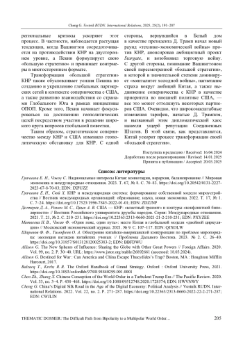 5. Шарипов Ф. Ф., Тимофеев О. А. Обострение китайско-американской конкуренции по проблеме миропорядка: эволюция взглядов китайских ученых // Проблемы Дальнего Востока. 2023. № 2. С. 26-40. ;. DOI: 10.31857/S013128120025383-2 EDN: BBFDWU