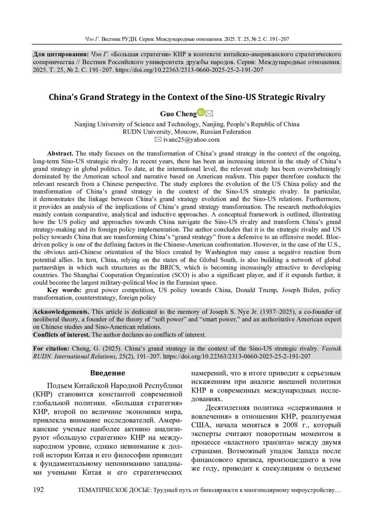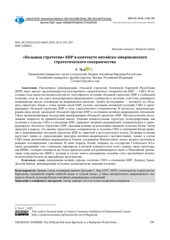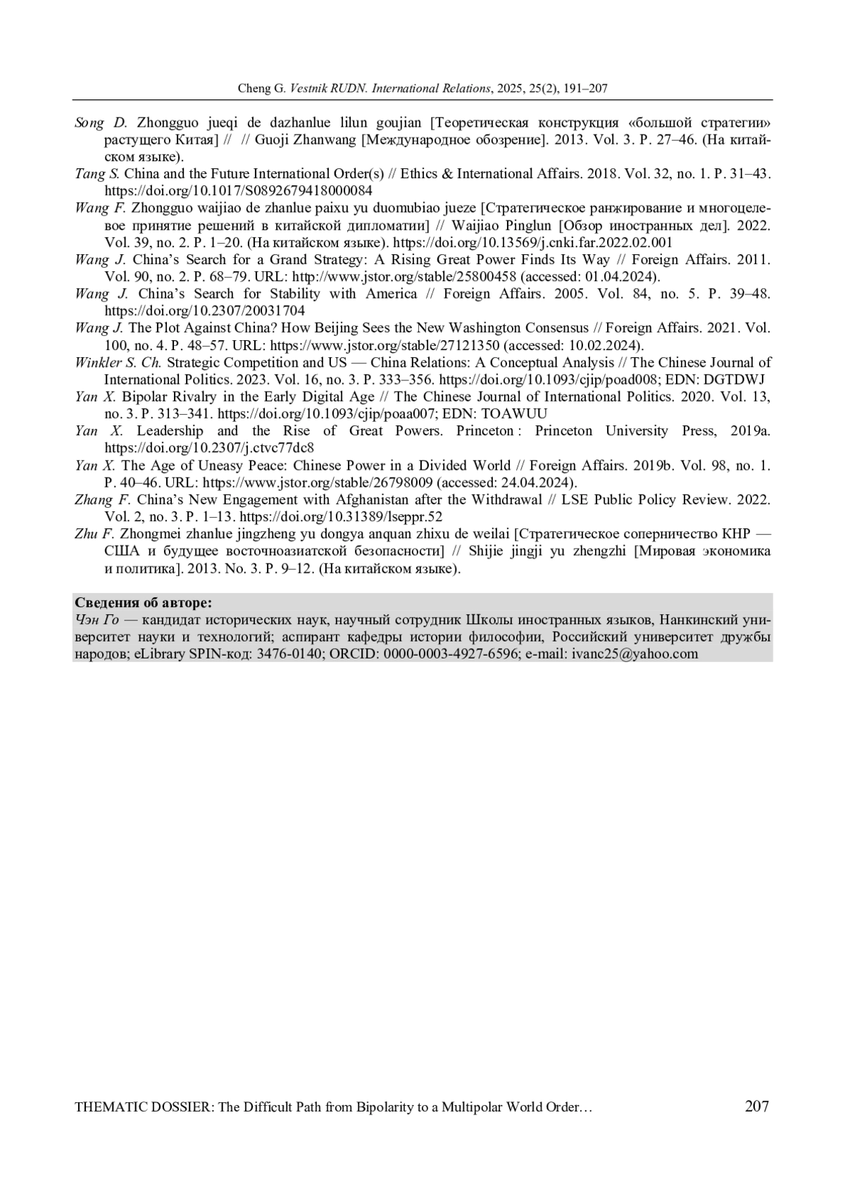 3. Дегтерев Д. А., Рамич М. С., Цвык А. В. США - КНР: “властный транзит” и контуры “конфликтной биполярности” // Вестник Российского университета дружбы народов. Серия: Международные отношения. 2021. Т. 21, № 2. С. 210-231. ;. DOI: 10.22363/2313-0660-2021-21-2-210-231 EDN: PXYZEE