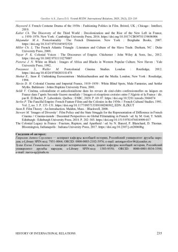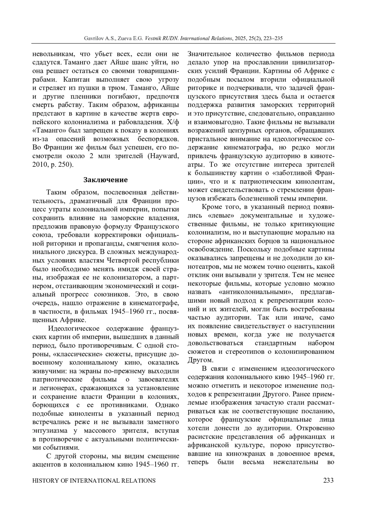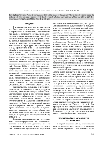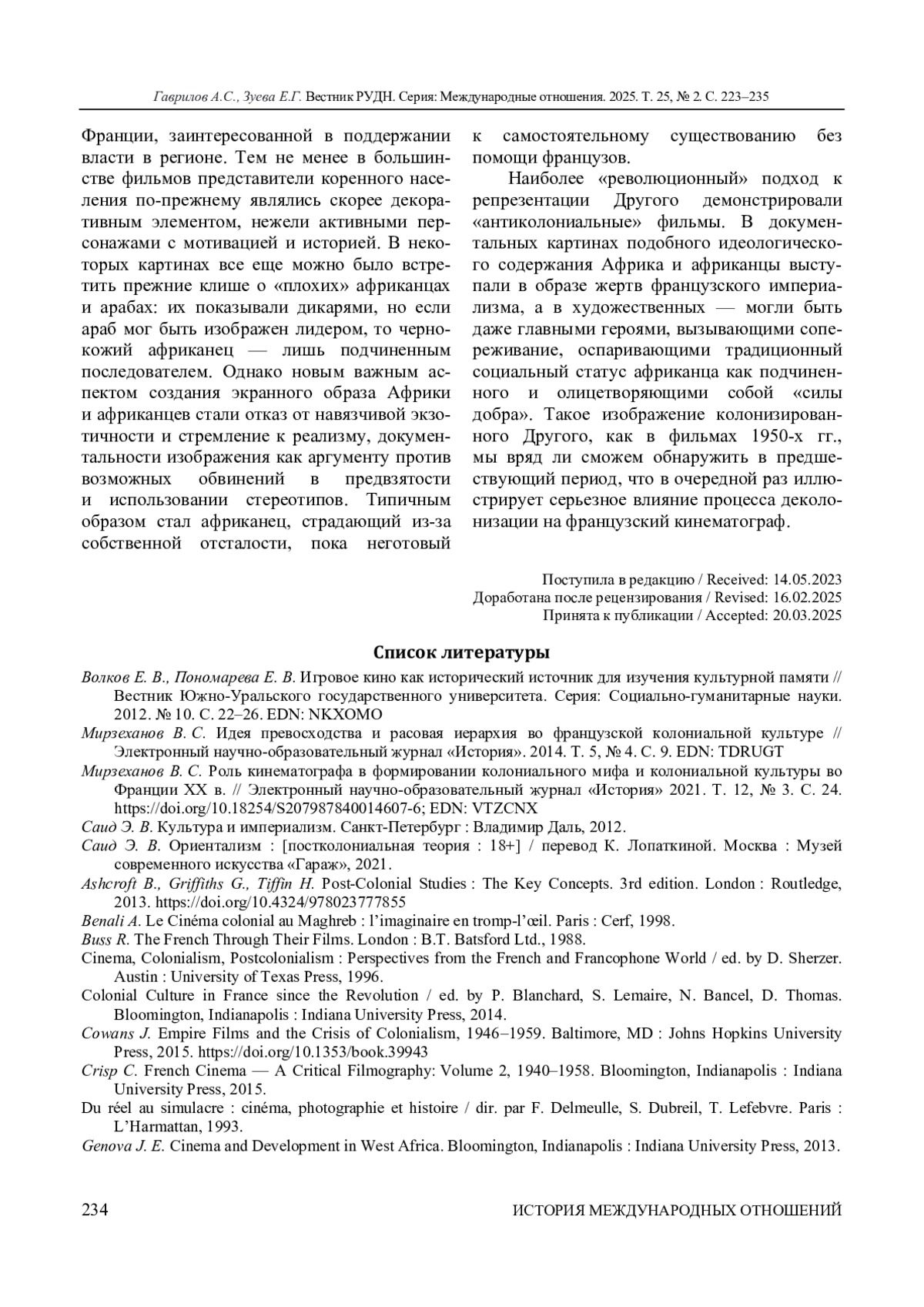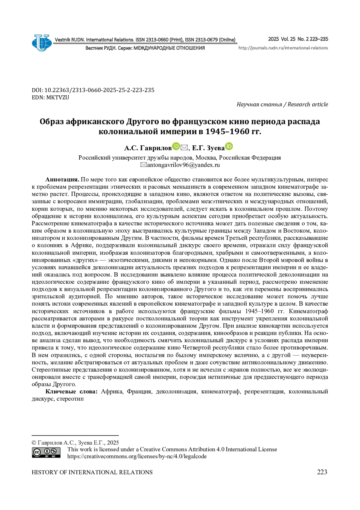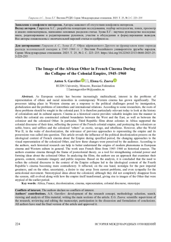 ГАВРИЛОВ А. С., ЗУЕВА Е. Г. ОБРАЗ АФРИКАНСКОГО ДРУГОГО ВО ФРАНЦУЗСКОМ КИНО ПЕРИОДА РАСПАДА КОЛОНИАЛЬНОЙ ИМПЕРИИ В 1945-1960 ГГ. // ВЕСТНИК РОССИЙСКОГО УНИВЕРСИТЕТА ДРУЖБЫ НАРОДОВ. СЕРИЯ: МЕЖДУНАРОДНЫЕ ОТНОШЕНИЯ. 2025. ТОМ 25 № 2
