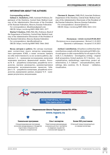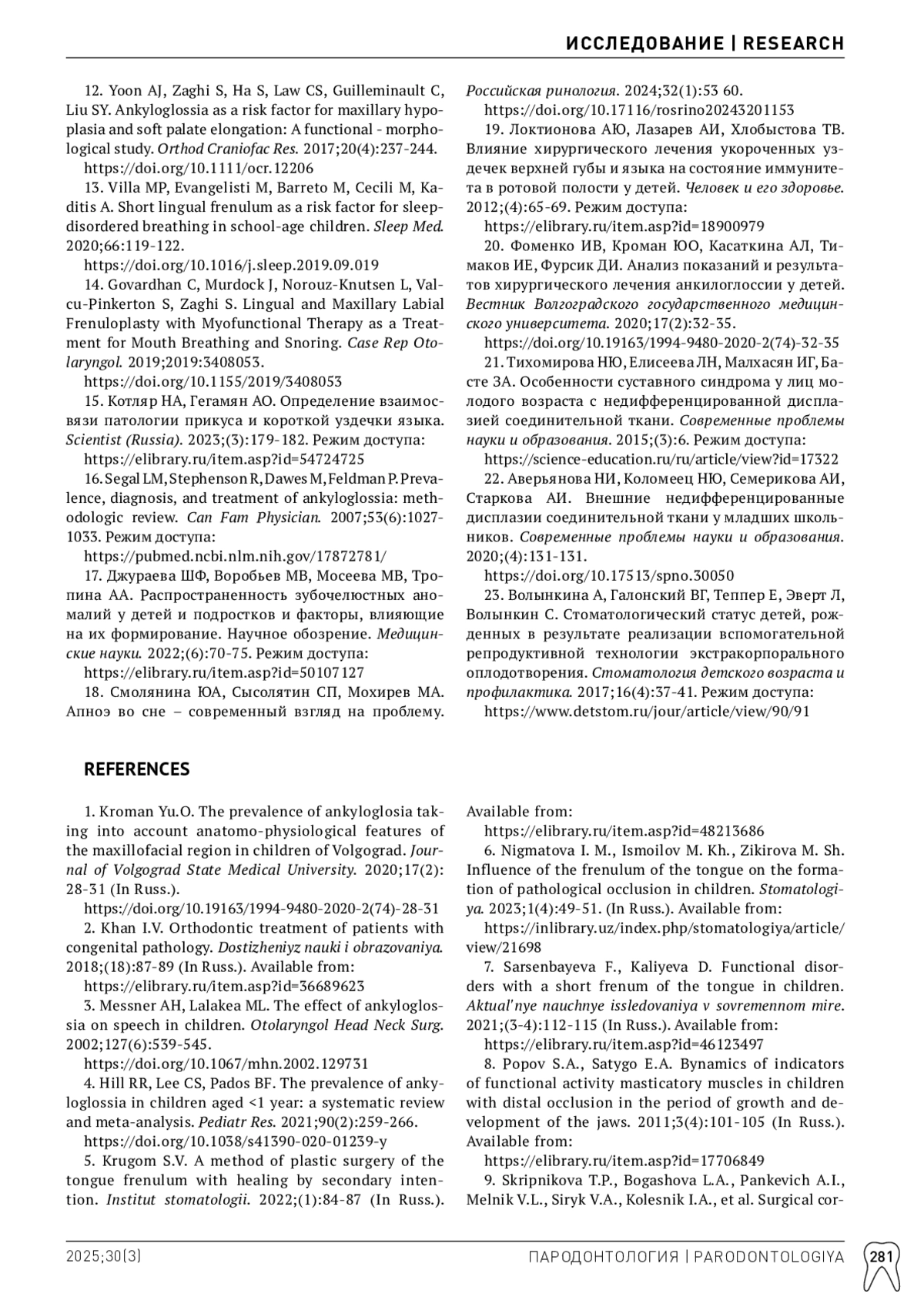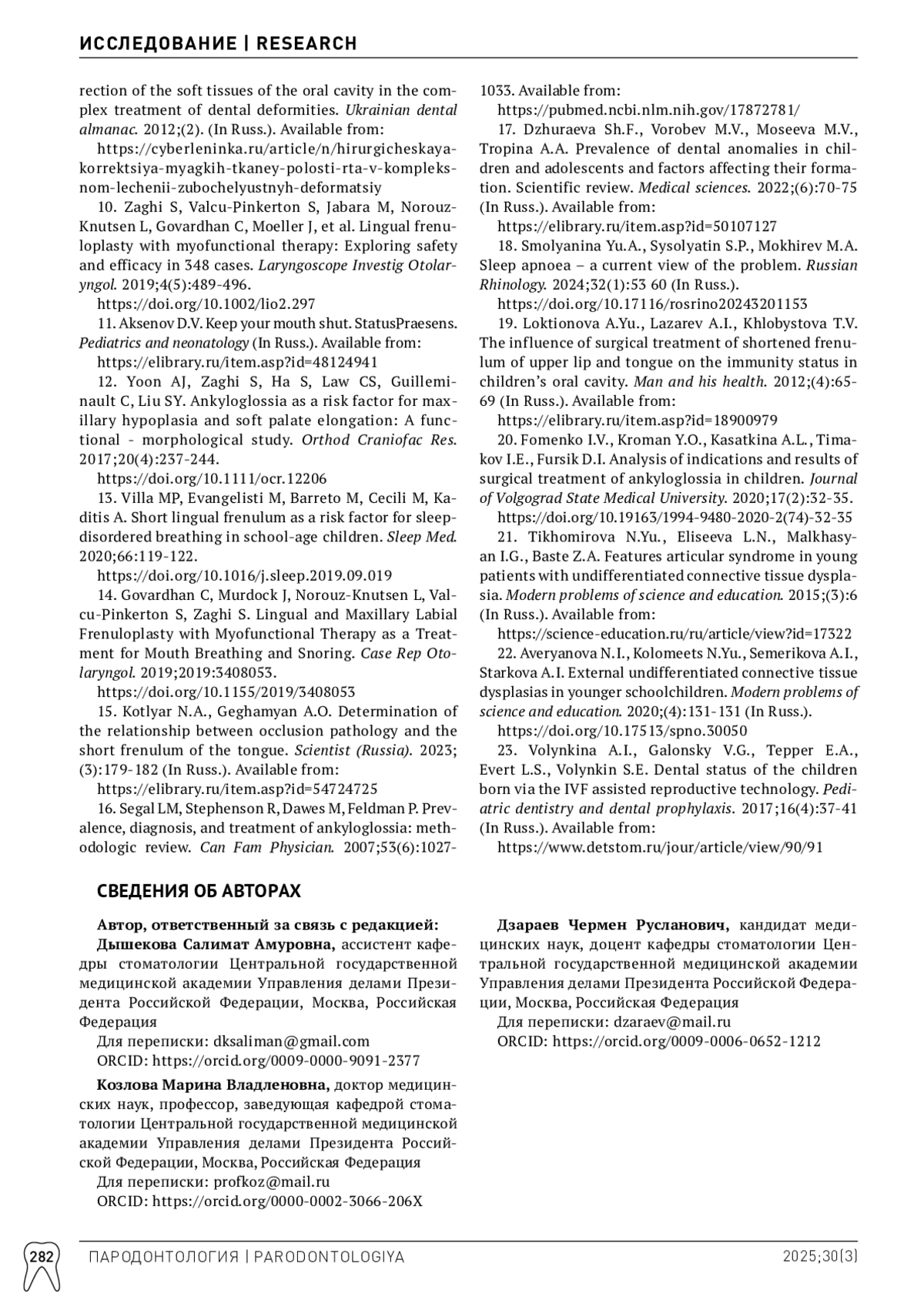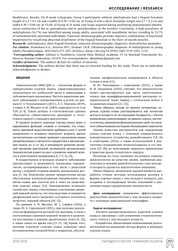 ДЫШЕКОВА С. А., КОЗЛОВА М. В., ДЗАРАЕВ Ч. Р. УЛЬТРАЗВУКОВАЯ ДИАГНОСТИКА АНКИЛОГЛОССИИ У ЛИЦ МОЛОДОГО ВОЗРАСТА // ПАРОДОНТОЛОГИЯ. 2025. № 3, ТОМ 30