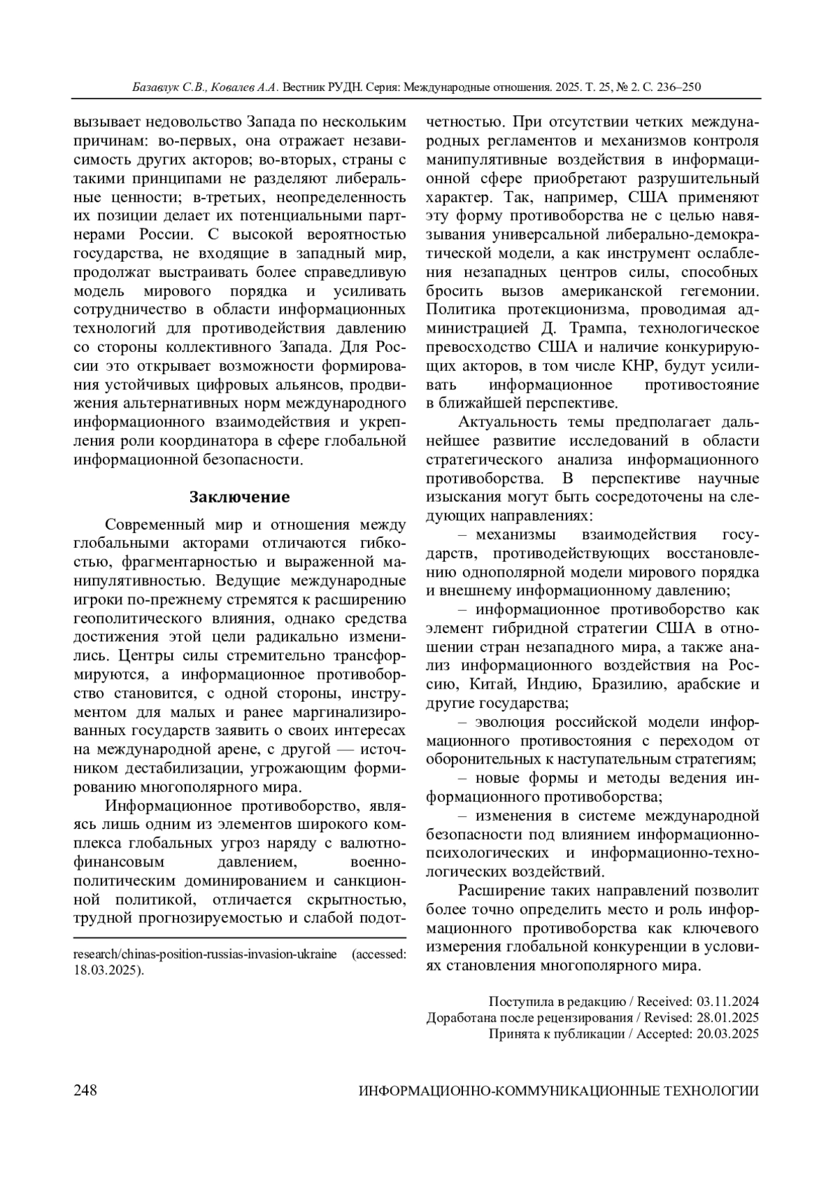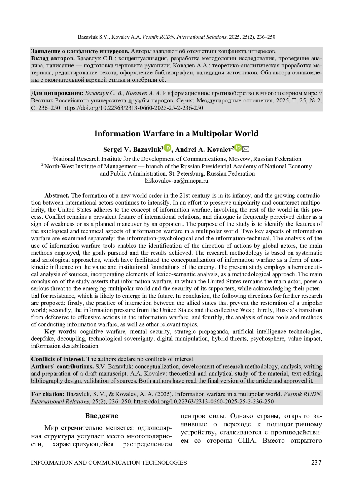 Формирование нового миропорядка в XXI в. находится в стадии становления, а нарастающее противоречие между международными акторами продолжает усиливаться. США, стремясь сохранить однополярность и противодействуя многополярности, придерживаются концепции информационного противоборства, вовлекая в этот процесс остальной мир. Конфликтность в международных отношениях сохраняется, а диалог часто воспринимается либо как проявление слабости, либо как спланированный маневр оппонента.