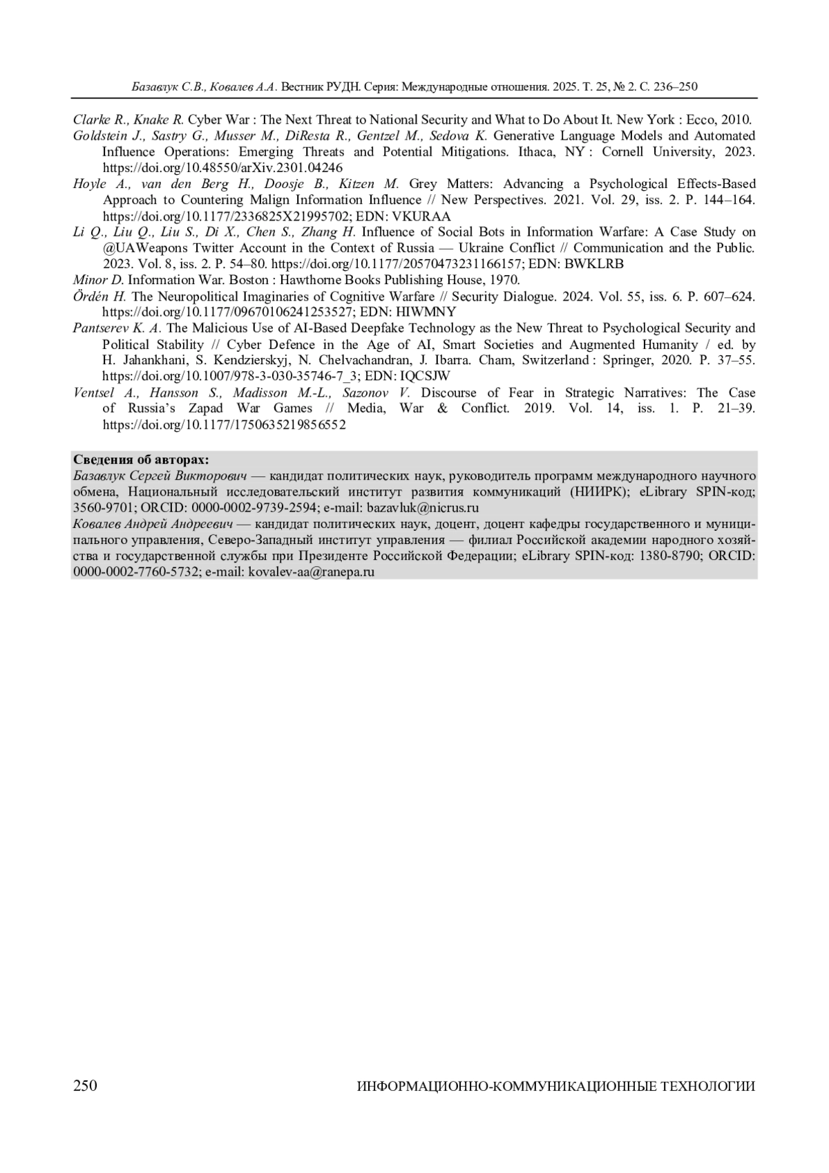 6. Гончарова И. В., Ницевич В. Ф., Судоргин О. А. Информационная война как инструмент политического противостояния в современном многополярном мире // Вестник Российского университета дружбы народов. Серия: Государственное и муниципальное управление. 2024. Т. 11, № 1. С. 19-31. ;. DOI: 10.22363/2312-8313-2024-11-1-19-31 EDN: ZIXNDI