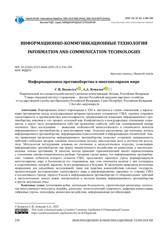 Цель исследования - выявление особенностей аксиологического и технического аспектов информационного противоборства в многополярном мире. Отдельно рассмотрены два ключевых аспекта информационного противоборства: информационно-психологический и информационно-технический. Анализ применения инструментов информационного противоборства позволяет установить направленность действий глобальных акторов, основные используемые методы, преследуемые цели и достигнутые результаты. Методология исследования основана на системном и аксиологическом подходах, позволивших информационное противоборство как форму некинетического воздействия на ценностные и институциональные основы противника. В качестве метода применен герменевтический анализ первоисточников с элементами лексико-семантического разбора. Авторами сделан вывод, что информационное противоборство, главным субъектом которого остаются США, представляет серьезную угрозу формирующемуся многополярному миру и безопасности его сторонников, при этом отмечается наличие у них потенциала к сопротивлению, который, вероятно, будет раскрываться в будущем. В заключении приводятся возможные направления для дальнейших исследований, такие как практика взаимодействия союзных государств, препятствующих восстановлению однополярного мира и информационному давлению со стороны США и коллективного Запада; переход России в информационном противоборстве от оборонительных действий к наступательным; анализ новых инструментов и методов ведения информационного противоборства и другие актуальные темы.
