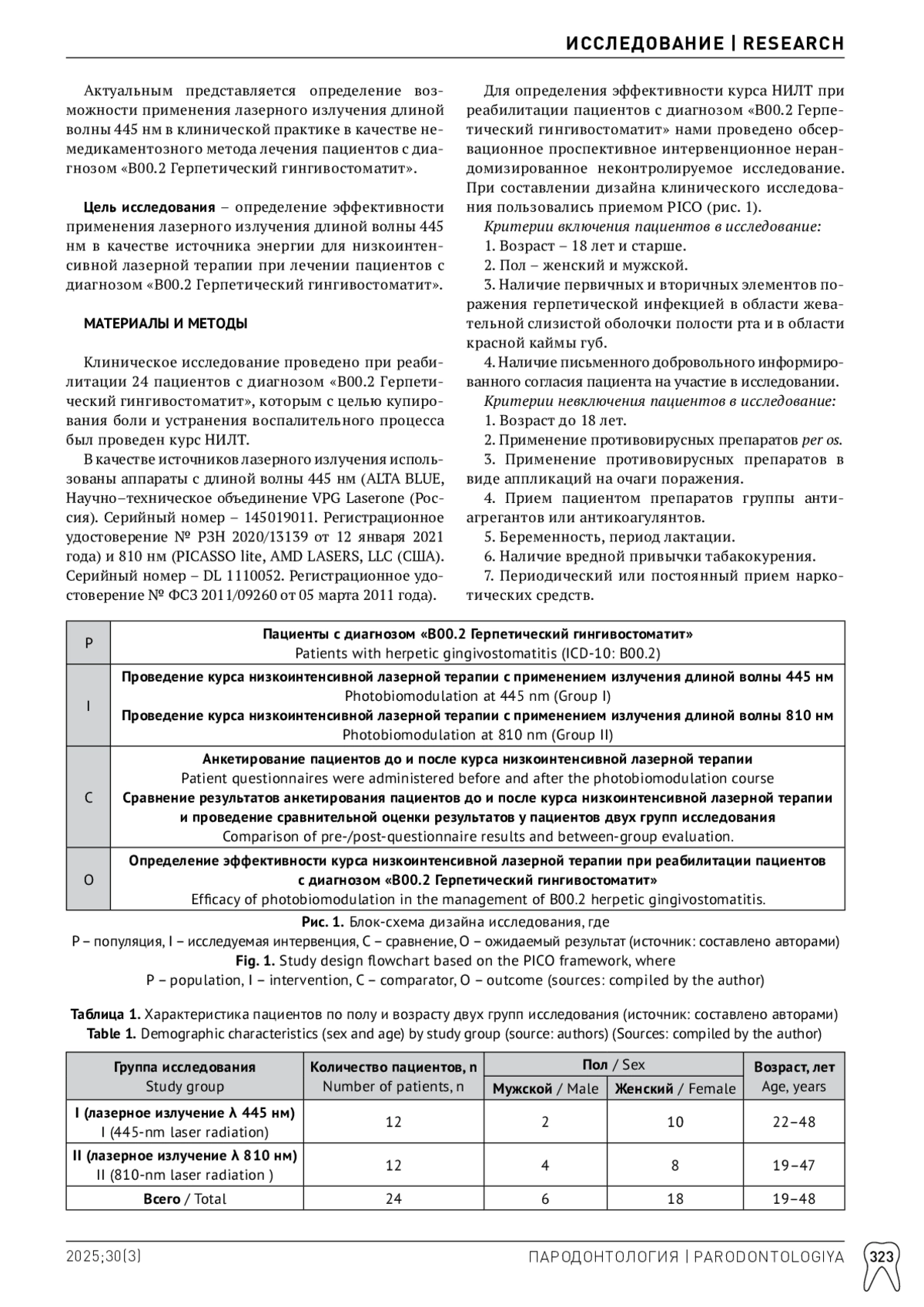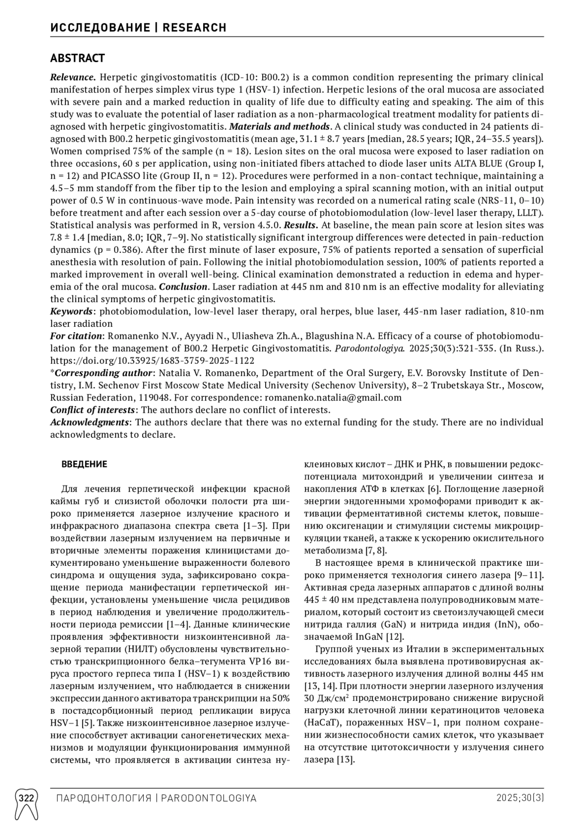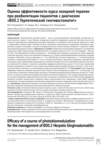 Актуальность. Герпетический гингивостоматит – одно из распространенных заболеваний, вызываемых вирусом простого герпеса I типа. Наличие вторничных элементов поражения слизистой оболочки полости рта герпесом характеризуется выраженным болевым синдромом и снижением качества жизни пациентов в связи с ограничением приема пищи и активности речи. Актуальным представилось определение возможности применения лазерного излучения в качестве немедикаментозного метода лечения пациентов с диагнозом «В00.2 Герпетический гингивостоматит». Материалы и методы. Клиническое исследование проведено у 24 пациентов с диагнозом «В00.2 Герпетический гингивостоматит» со средним возрастом 31,10 ± 8,72 лет (медиана – 28,5 лет; 24, 35,5); 75% наблюдений составили женщины (n = 18). Воздействие лазерным излучением на очаги поражения слизистой оболочки полости рта проводили трехкратно по 1 минуте неинициированными волокнами лазерных аппаратов ALTA BLUE (I группа пациентов, n = 12) и PICASSO lite (II группа пациентов, n = 12) бесконтактным способом с соблюдением расстояния 4,5–5 мм от кончика световода до элементов поражения и динамической методикой в виде спиралевидных движений при начальной мощности 0,5 Вт и непрерывном режиме. Для оценки клинической ситуации у пациентов применяли цифровую рейтинговую шкалу от 0 до 10 для определения болевых ощущений до лечения и после сеансов низкоинтенсивной лазерной терапии в течение 5 суток. Статистический анализ выполнен с использованием среды программирования R 4.5.0. Результаты. При первичном обращении пациентов средний показатель боли в области очагов поражения составил 7,79 ± 1,41 балла [8; 7, 9]. Статистически значимых отличий между группами в отношении динамики боли установлено не было (p = 0,386). После 1-й минуты воздействия лазерным излучением на область поражения в 75% случаев наблюдения пациенты отмечали ощущение поверхностной анестезии и указывали на устранение боли. В 100% случаев наблюдения пациенты отмечали значительное улучшение общего самочувствия после проведения I сеанса НИЛТ. Данные клинического осмотра указывали на уменьшение выраженности отека и гиперемии слизистой оболочки полости рта. Заключение. Применение лазерного излучения длиной волн 445 нм и 810 нм является эффективным способом при устранении клинических симптомов герпетического гингивостоматита.