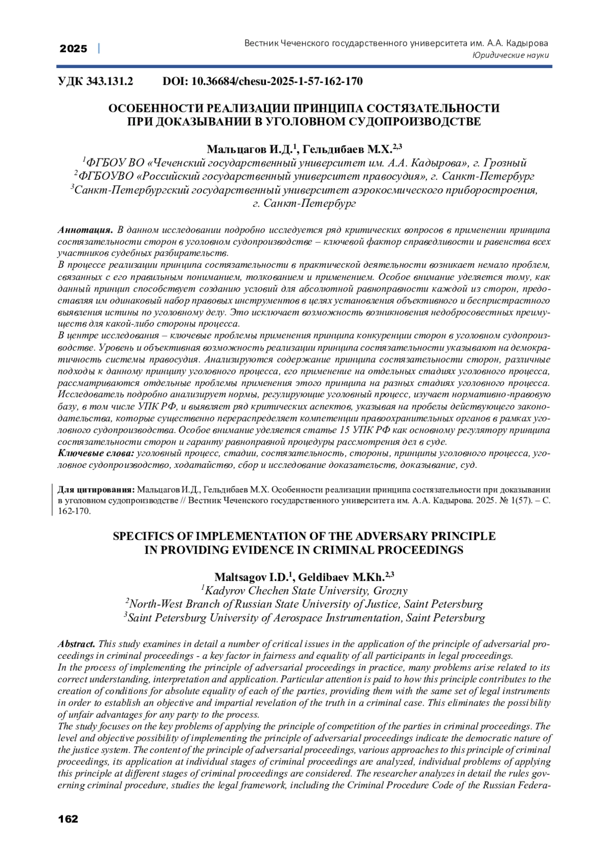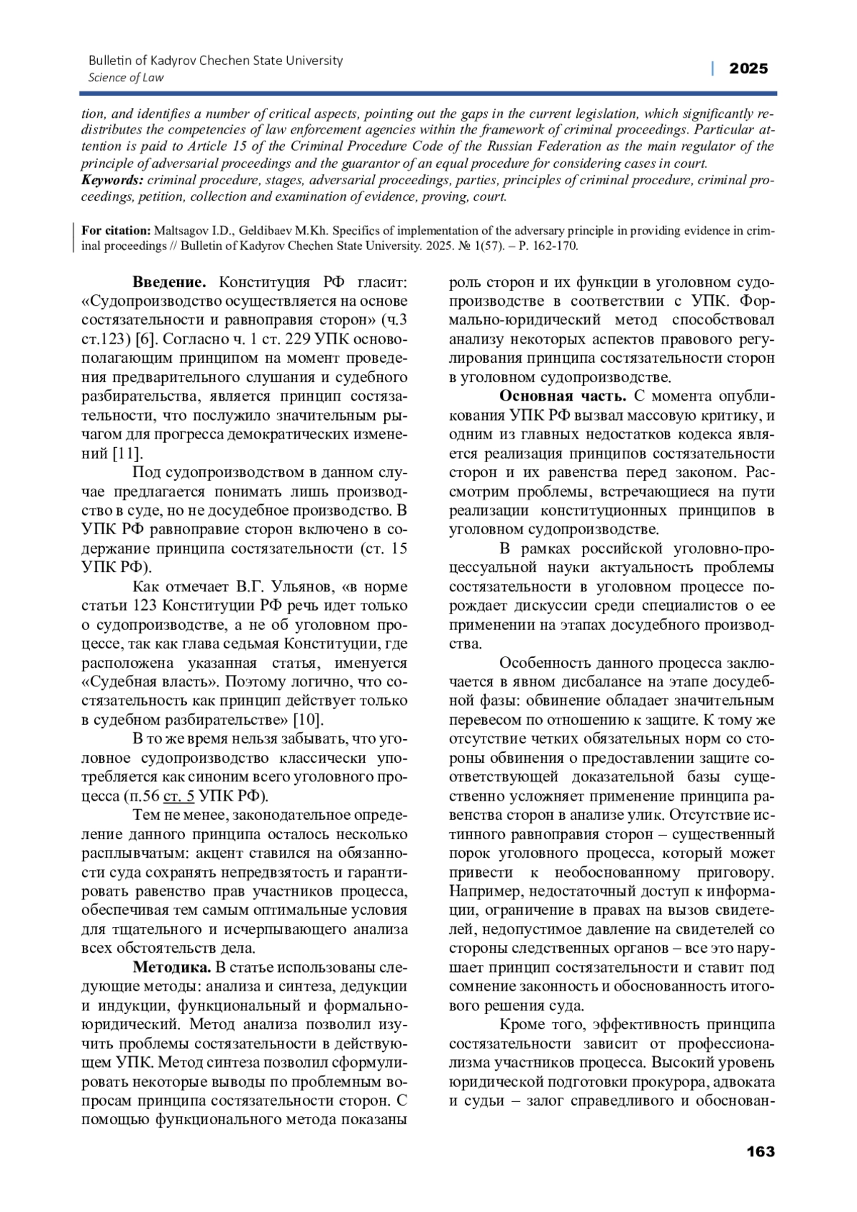В данном исследовании подробно исследуется ряд критических вопросов в применении принципа состязательности сторон в уголовном судопроизводстве - ключевой фактор справедливости и равенства всех участников судебных разбирательств. В процессе реализации принципа состязательности в практической деятельности возникает немало проблем, связанных с его правильным пониманием, толкованием и применением. Особое внимание уделяется тому, как данный принцип способствует созданию условий для абсолютной равноправности каждой из сторон, предоставляя им одинаковый набор правовых инструментов в целях установления объективного и беспристрастного выявления истины по уголовному делу. Это исключает возможность возникновения недобросовестных преимуществ для какой-либо стороны процесса. В центре исследования - ключевые проблемы применения принципа конкуренции сторон в уголовном судопроизводстве. Уровень и объективная возможность реализации принципа состязательности указывают на демократичность системы правосудия. Анализируются содержание принципа состязательности сторон, различные подходы к данному принципу уголовного процесса, его применение на отдельных стадиях уголовного процесса, рассматриваются отдельные проблемы применения этого принципа на разных стадиях уголовного процесса. Исследователь подробно анализирует нормы, регулирующие уголовный процесс, изучает нормативно-правовую базу, в том числе УПК РФ, и выявляет ряд критических аспектов, указывая на пробелы действующего законодательства, которые существенно перераспределяет компетенции правоохранительных органов в рамках уголовного судопроизводства. Особое внимание уделяется статье 15 УПК РФ как основному регулятору принципа состязательности сторон и гаранту равноправной процедуры рассмотрения дел в суде.