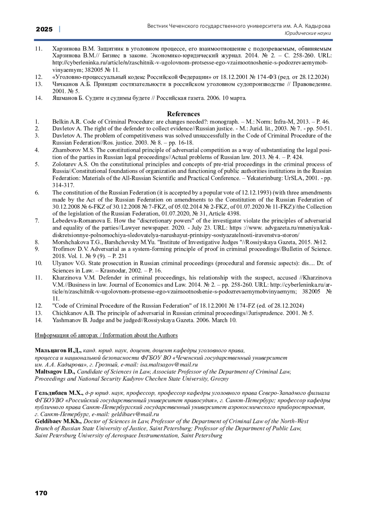 11. Харзинова В.М. Защитник в уголовном процессе, его взаимоотношение с подозреваемым, обвиняемым Харзинова В.М.// Бизнес в законе. Экономико-юридический журнал. 2014. № 2. - С. 258-260. URL: http://cyberleninka.ru/article/n/zaschitnik-v-ugolovnom-protsesse-ego-vzaimootnoshenie-s-podozrevaemymobvinyaemym; 382005 № 11.