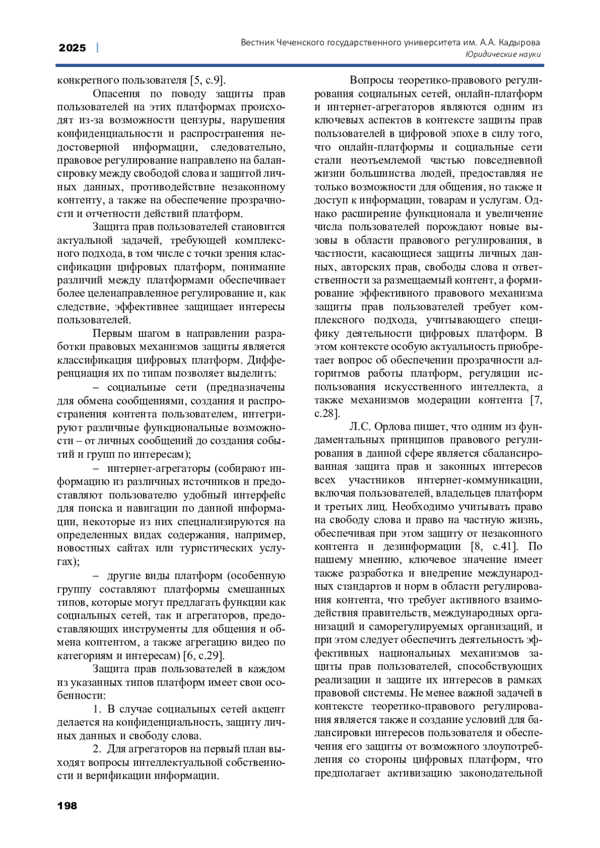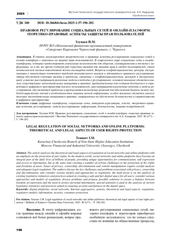 В статье анализируются теоретические и правовые аспекты регулирования социальных сетей и онлайн-платформ с акцентом на защиту прав пользователей. В современном мире социальные сети и онлайн-платформы, которые предоставляют уникальные возможности для общения, самовыражения и доступа к информации, но в то же время создают ряд серьезных вызовов для защиты прав и свобод пользователей, стали неотъемлемой частью повседневной жизни миллиардов людей. Вопросы конфиденциальности, цензуры, дискриминации и манипуляции контентом требуют внимательного анализа и адекватного правового регулирования. Автор обсуждает ключевые вызовы и проблемы, связанные с конфиденциальностью, цензурой и дискриминацией, а также рассматривает различные модели и подходы к регулированию; основное внимание уделяется анализу существующих законодательных инициатив и практик, предназначенных для создания безопасного и справедливого цифрового пространства для всех пользователей; рассматриваются различные подходы и модели регулирования, обсуждаются проблемы и предлагаются возможные решения для обеспечения баланса между свободой выражения мнений и необходимостью защиты личной информации; особое внимание уделяется анализу текущих законодательных инициатив и практик, направленных на обеспечение безопасности и справедливости в цифровом пространстве.