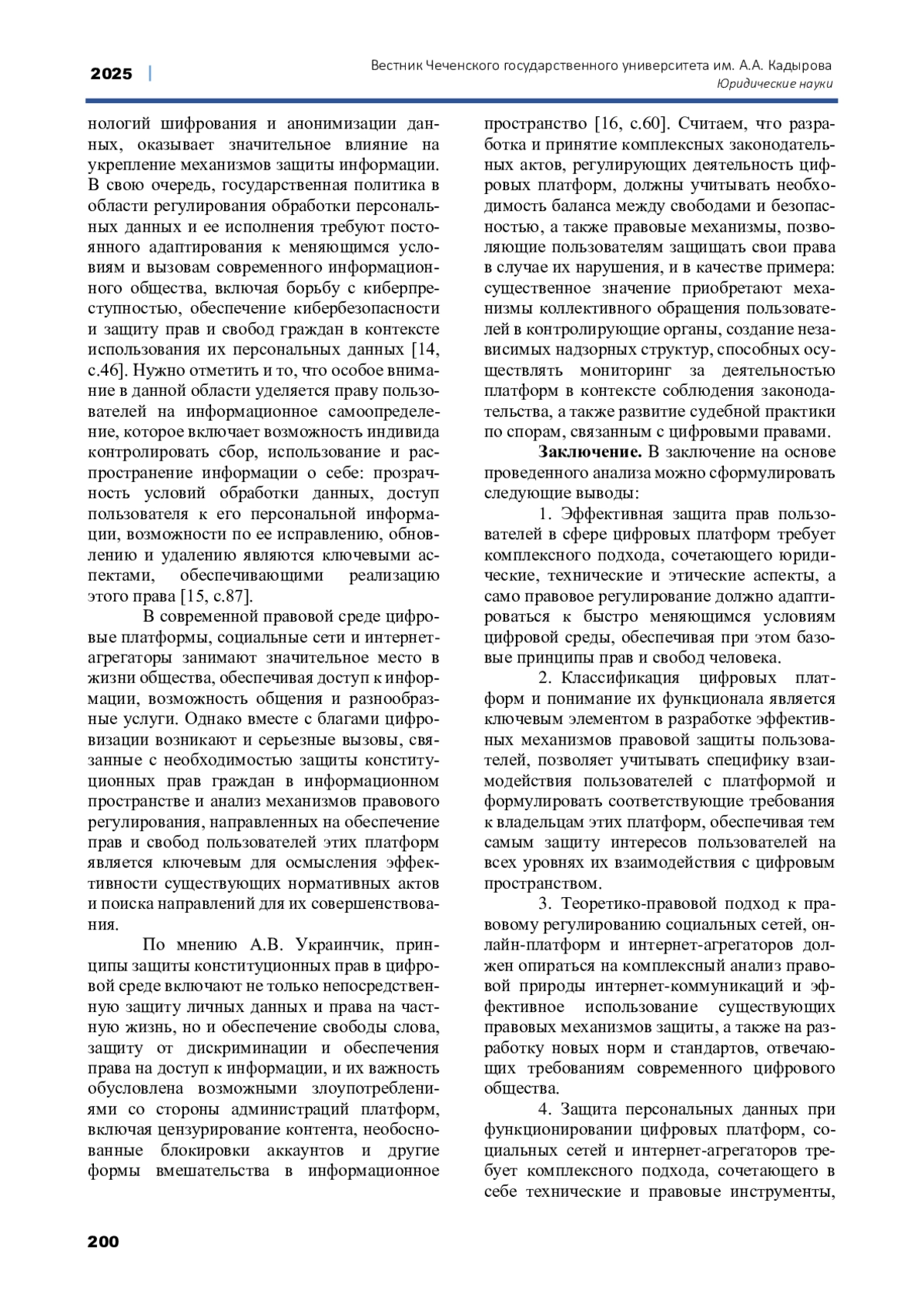 16. Украинчик А.В. Реализация и защита конституционных прав граждан в условиях цифровизации общества // Вестник экспертного совета. 2022. №4 (31). - С. 58-66. EDN: NEGPZW