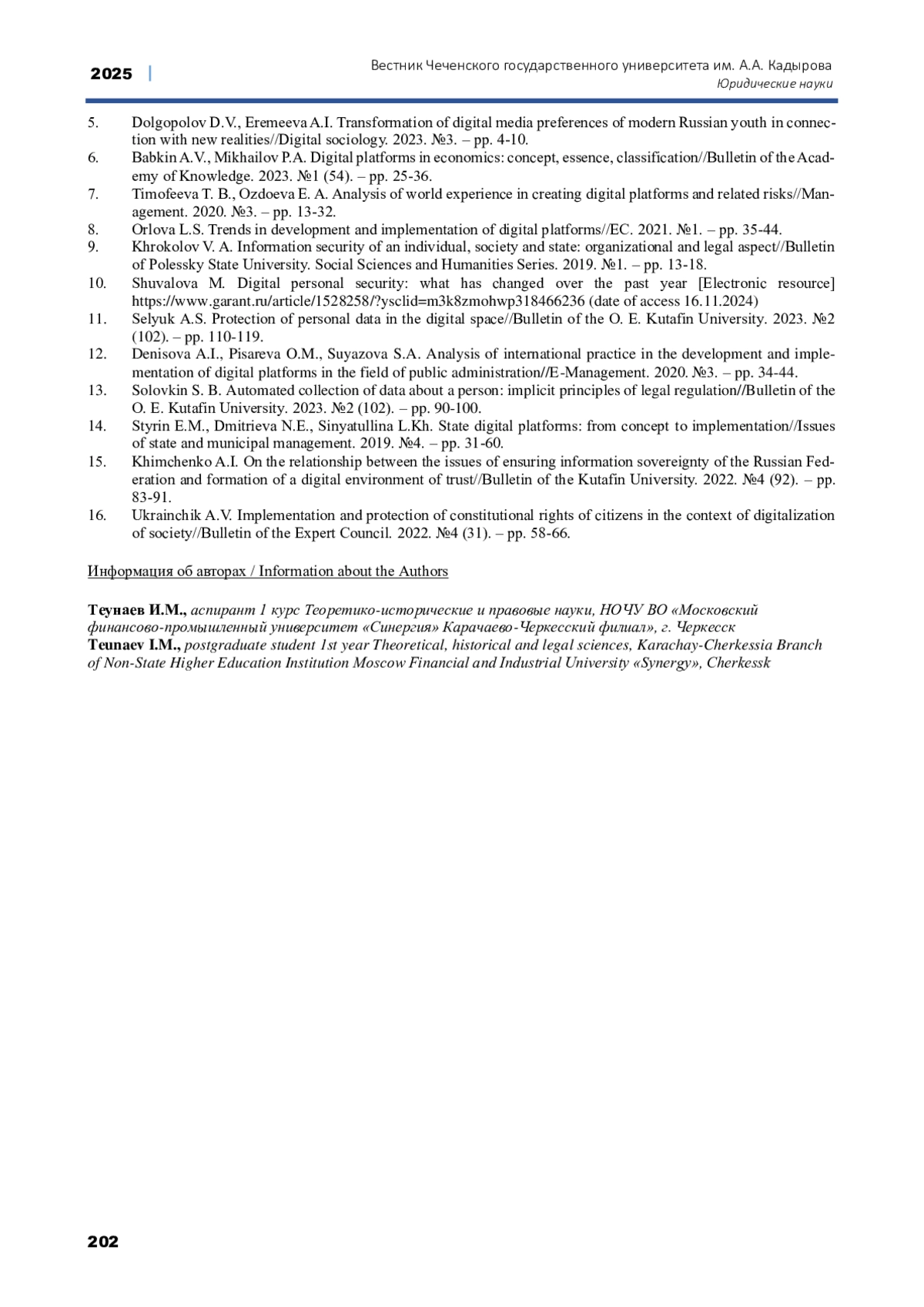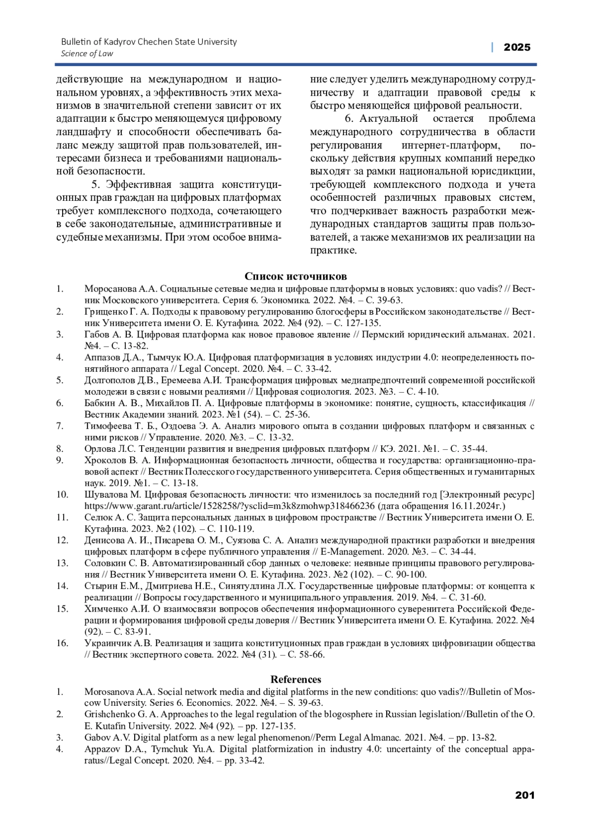4. Аппазов Д.А., Тымчук Ю.А. Цифровая платформизация в условиях индустрии 4.0: неопределенность понятийного аппарата // Legal Concept. 2020. №4. - С. 33-42.