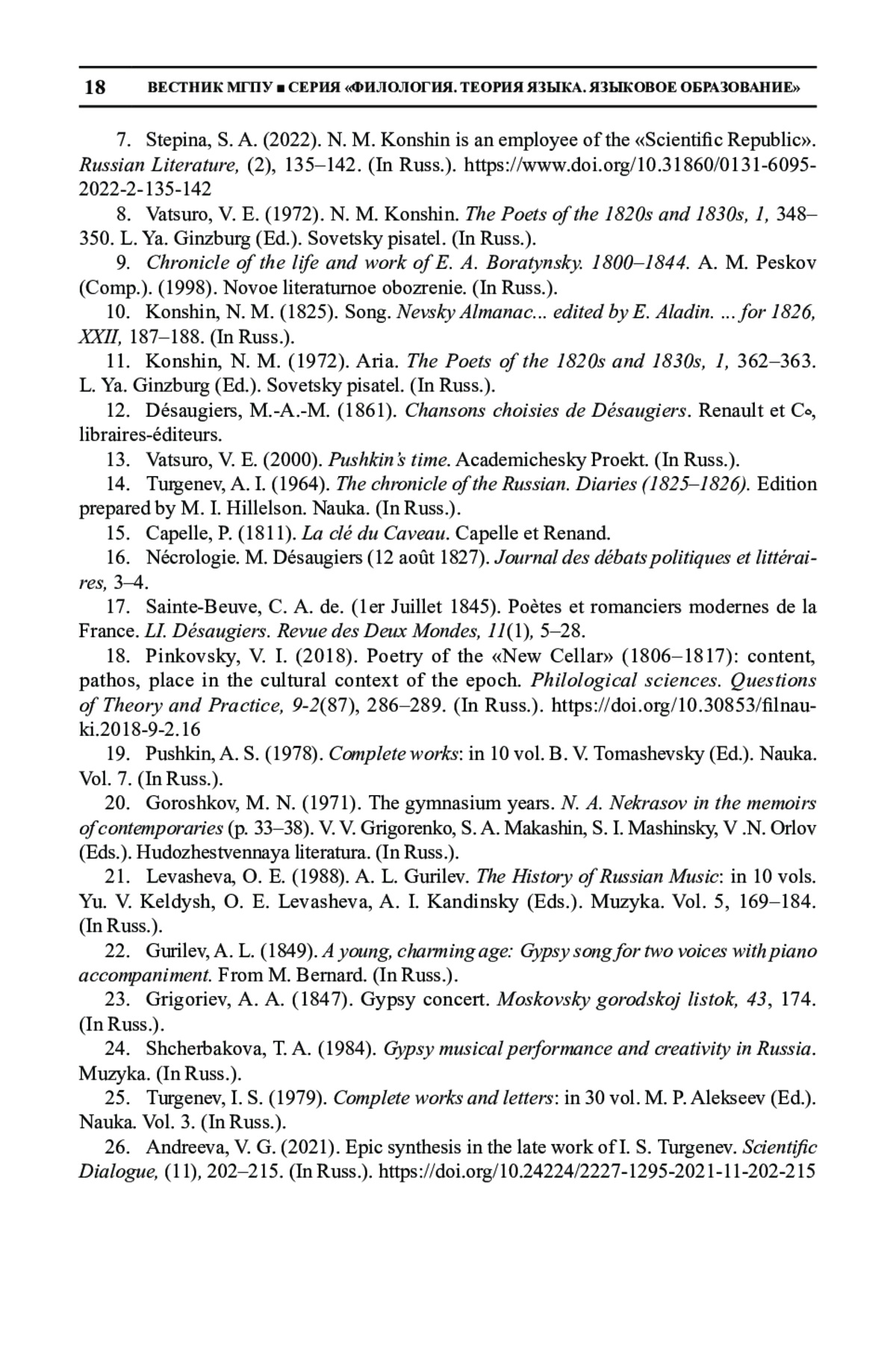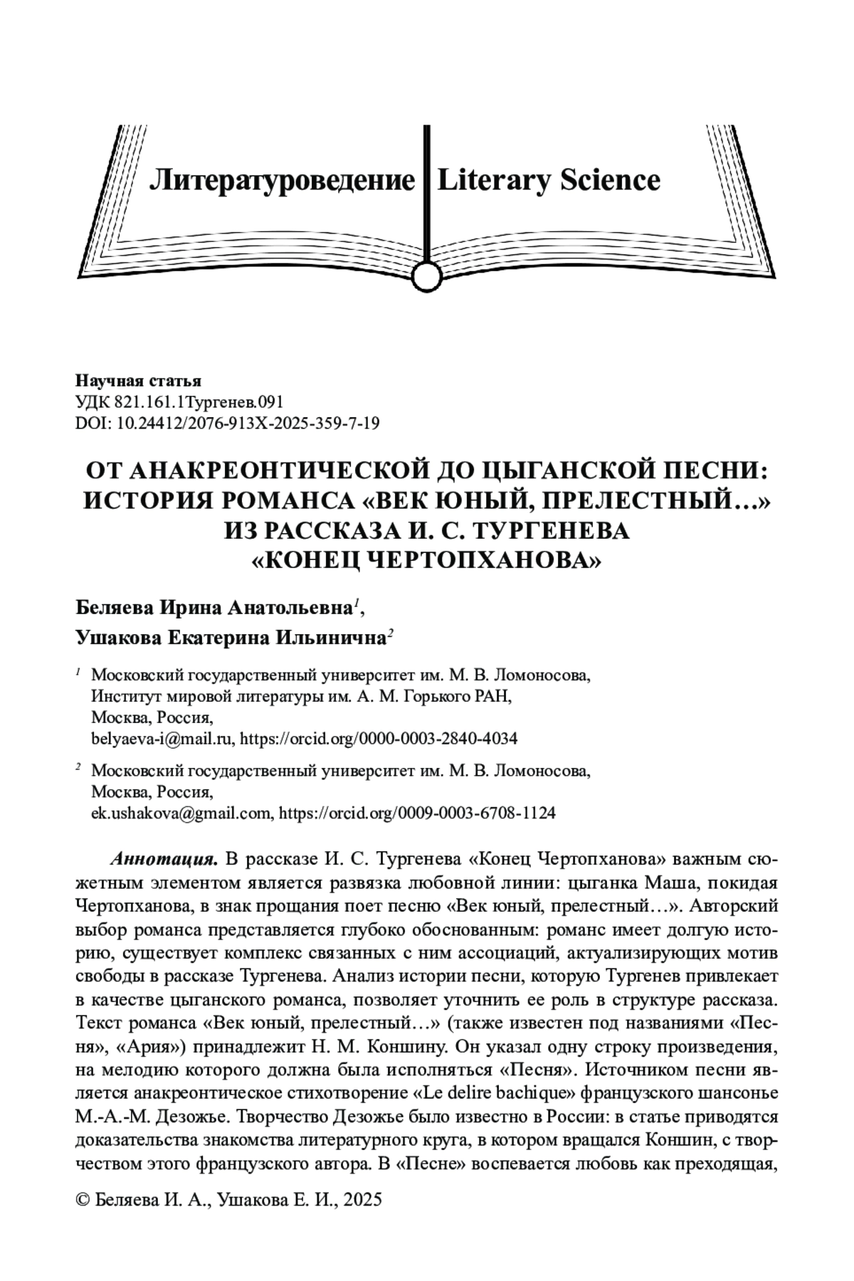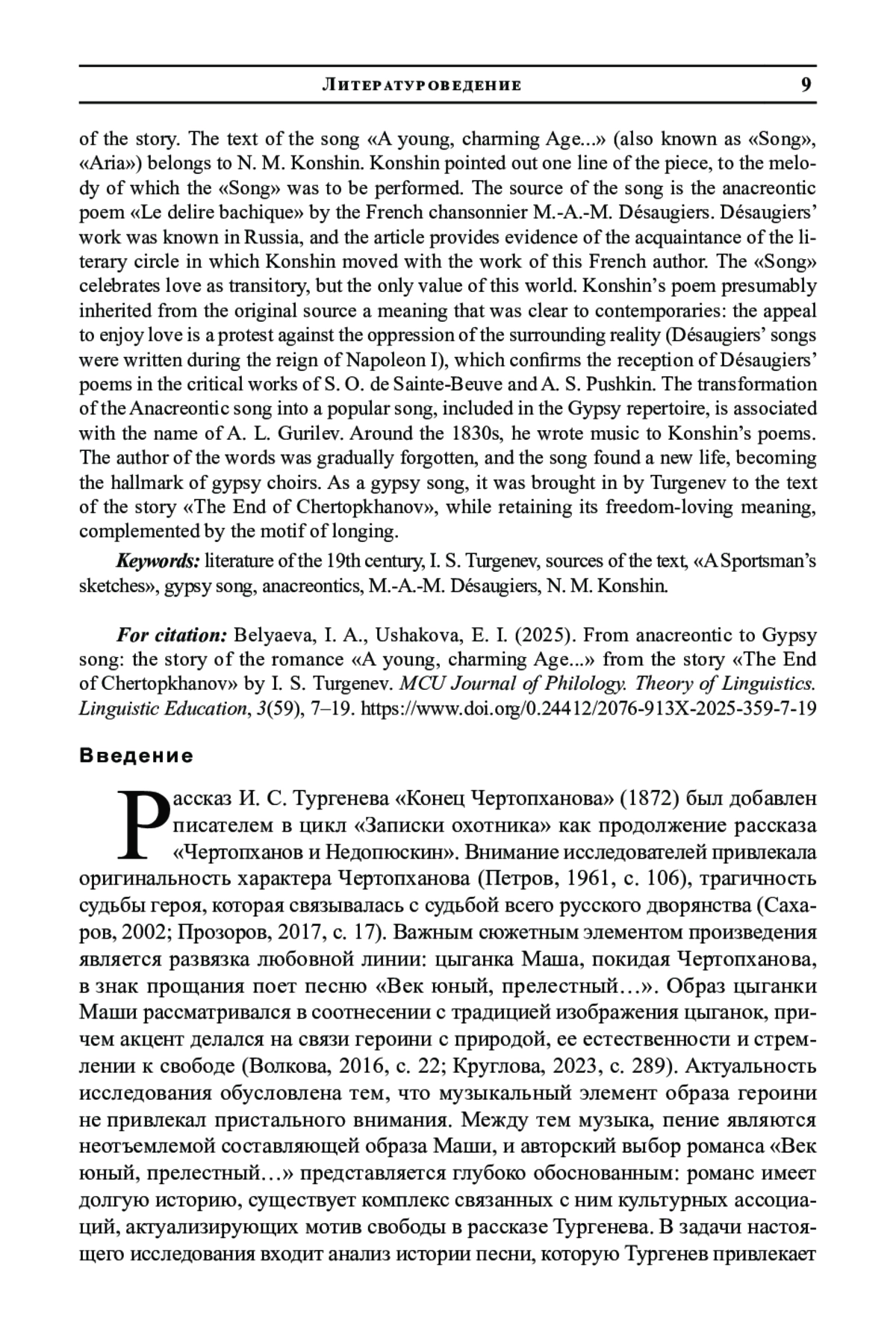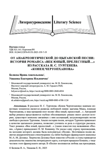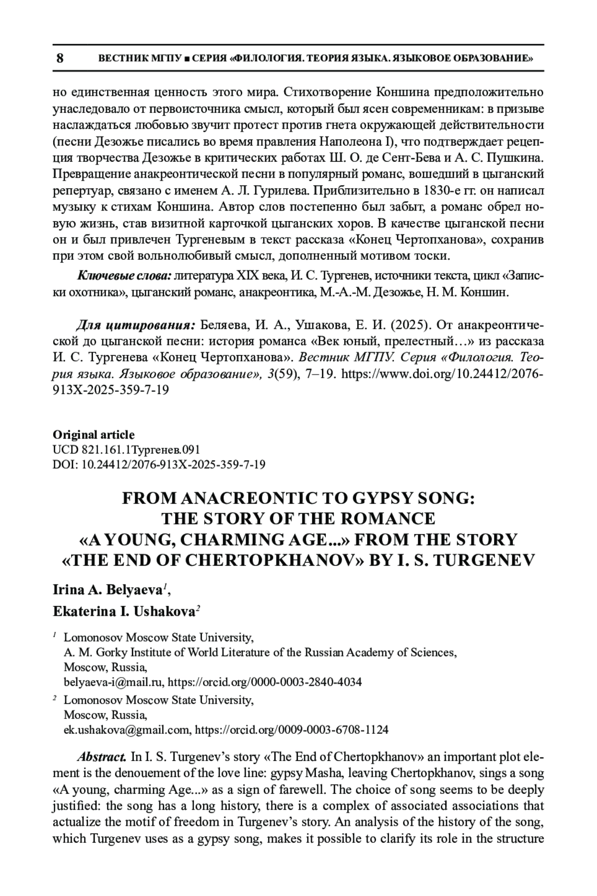 БЕЛЯЕВА И. А., УШАКОВА Е. И. ОТ АНАКРЕОНТИЧЕСКОЙ ДО ЦЫГАНСКОЙ ПЕСНИ: ИСТОРИЯ РОМАНСА «ВЕК ЮНЫЙ, ПРЕЛЕСТНЫЙ...» ИЗ РАССКАЗА И. С. ТУРГЕНЕВА «КОНЕЦ ЧЕРТОПХАНОВА» // ВЕСТНИК МГПУ. СЕРИЯ: ФИЛОЛОГИЯ. ТЕОРИЯ ЯЗЫКА. ЯЗЫКОВОЕ ОБРАЗОВАНИЕ. 2025. № 3 (59)