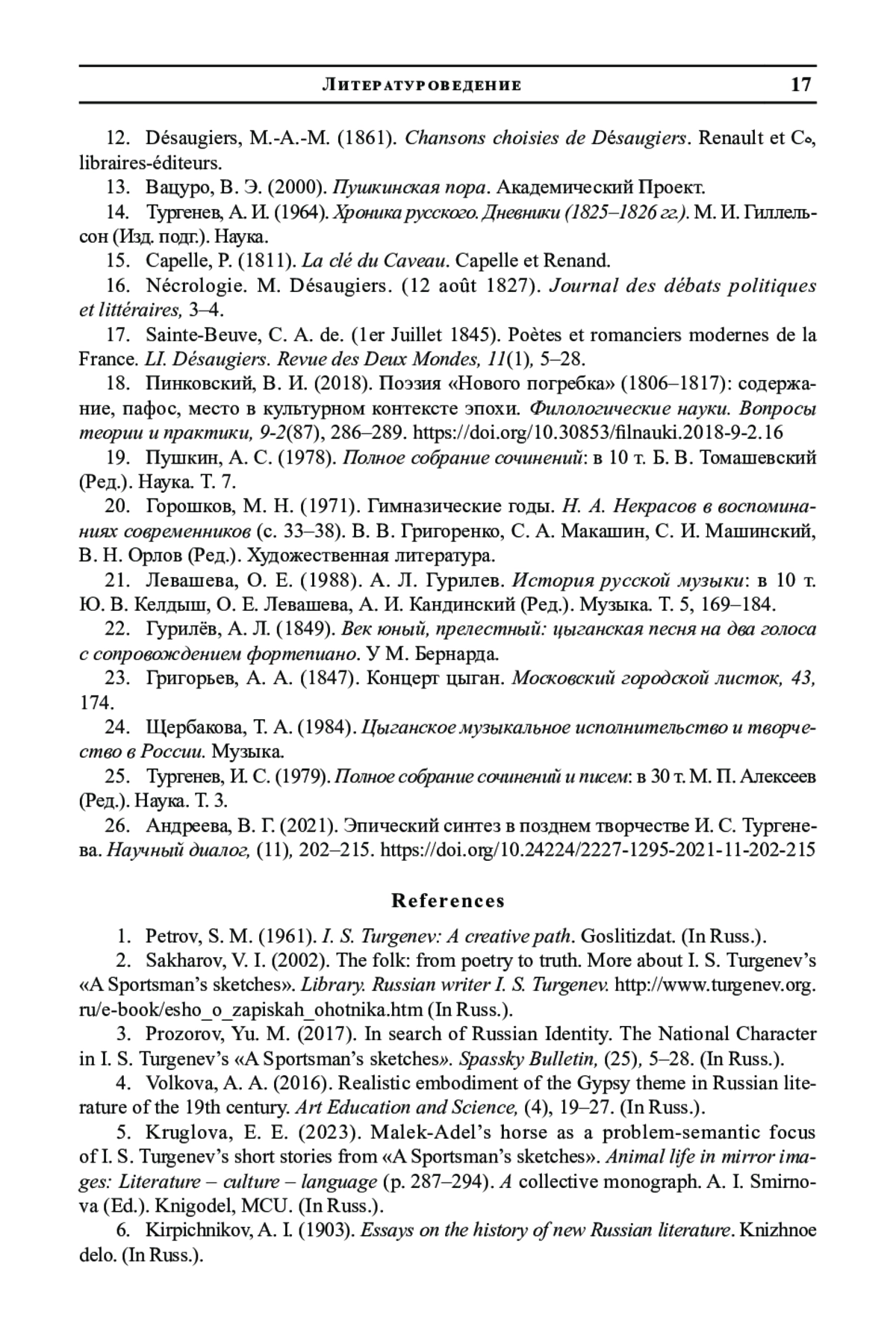 Статья: ОТ АНАКРЕОНТИЧЕСКОЙ ДО ЦЫГАНСКОЙ ПЕСНИ: ИСТОРИЯ РОМАНСА «ВЕК ЮНЫЙ, ПРЕЛЕСТНЫЙ...» ИЗ РАССКАЗА И. С. ТУРГЕНЕВА «КОНЕЦ ЧЕРТОПХАНОВА» (2025)