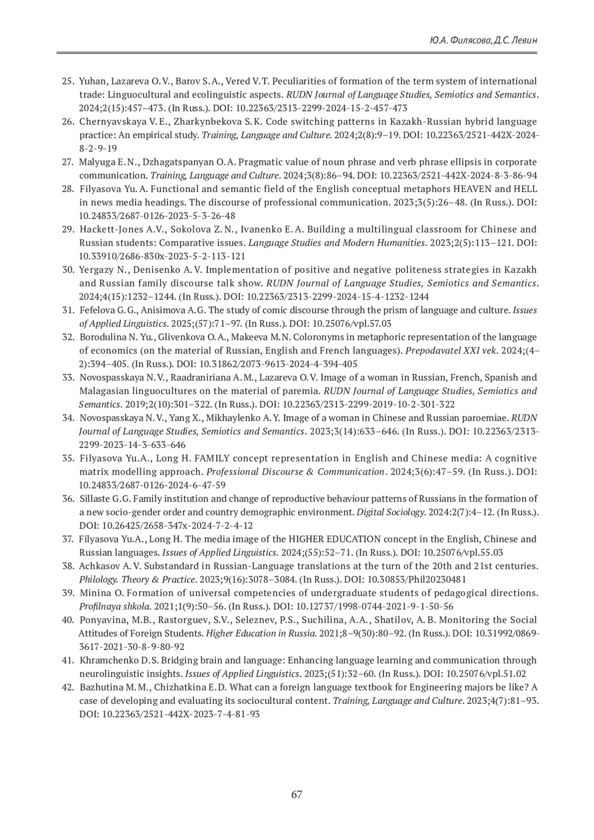 37. Филясова Ю. А., Лун Х. Медиаобраз концепта ВЫСШЕЕ ОБРАЗОВАНИЕ на материале английского, китайского и русского языков. Вопросы прикладной лингвистики. 2024;(55);52-71. https://doi.org/10.25076/vpl.55.03