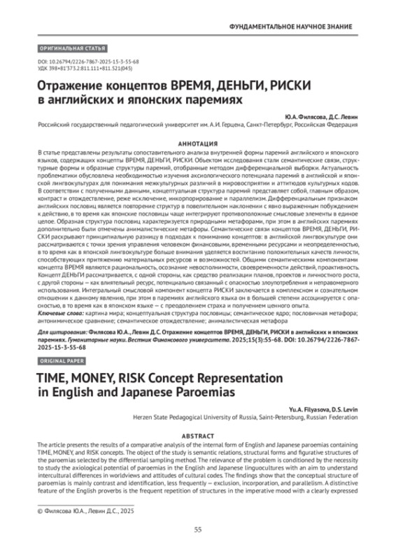 В статье представлены результаты сопоставительного анализа внутренней формы паремий английского и японского языков, содержащих концепты ВРЕМЯ, ДЕНЬГИ, РИСКИ. Объектом исследования стали семантические связи, структурные формы и образные структуры паремий, отобранные методом дифференциальной выборки. Актуальность проблематики обусловлена необходимостью изучения аксиологического потенциала паремий в английской и японской лингвокультурах для понимания межкультурных различий в мировосприятии и аттитюдов культурных кодов. В соответствии с полученными данными, концептуальная структура паремий представляет собой, главным образом, контраст и отождествление, реже исключение, инкорпорирование и параллелизм. Дифференциальным признаком английских пословиц является повторение структур в повелительном наклонении с явно выраженным побуждением к действию, в то время как японские пословицы чаще интегрируют противоположные смысловые элементы в единое целое. Образная структура пословиц характеризуется природными метафорами, при этом в английских паремиях дополнительно были отмечены анималистические метафоры. Семантические связи концептов ВРЕМЯ, ДЕНЬГИ, РИСКИ раскрывают принципиальную разницу в подходах к пониманию концептов: в английской лингвокультуре они рассматриваются с точки зрения управления человеком финансовыми, временными ресурсами и неопределенностью, в то время как в японской лингвокультуре больше внимания уделяется воспитанию положительных качеств личности, способствующих притяжению материальных ресурсов и возможностей. Общими семантическими компонентами концепта ВРЕМЯ являются рациональность, осознание невосполнимости, своевременности действий, проактивность. Концепт ДЕНЬГИ рассматривается, с одной стороны, как средство реализации планов, проектов и личностного роста, с другой стороны — как влиятельный ресурс, потенциально связанный с опасностью злоупотребления и неправомерного использования. Интегральный смысловой компонент концепта РИСКИ заключается в комплексном и сознательном отношении к данному явлению, при этом в паремиях английского языка он в большей степени ассоциируется с опасностью, в то время как в японском языке — с преодолением страха и получением ценного опыта.