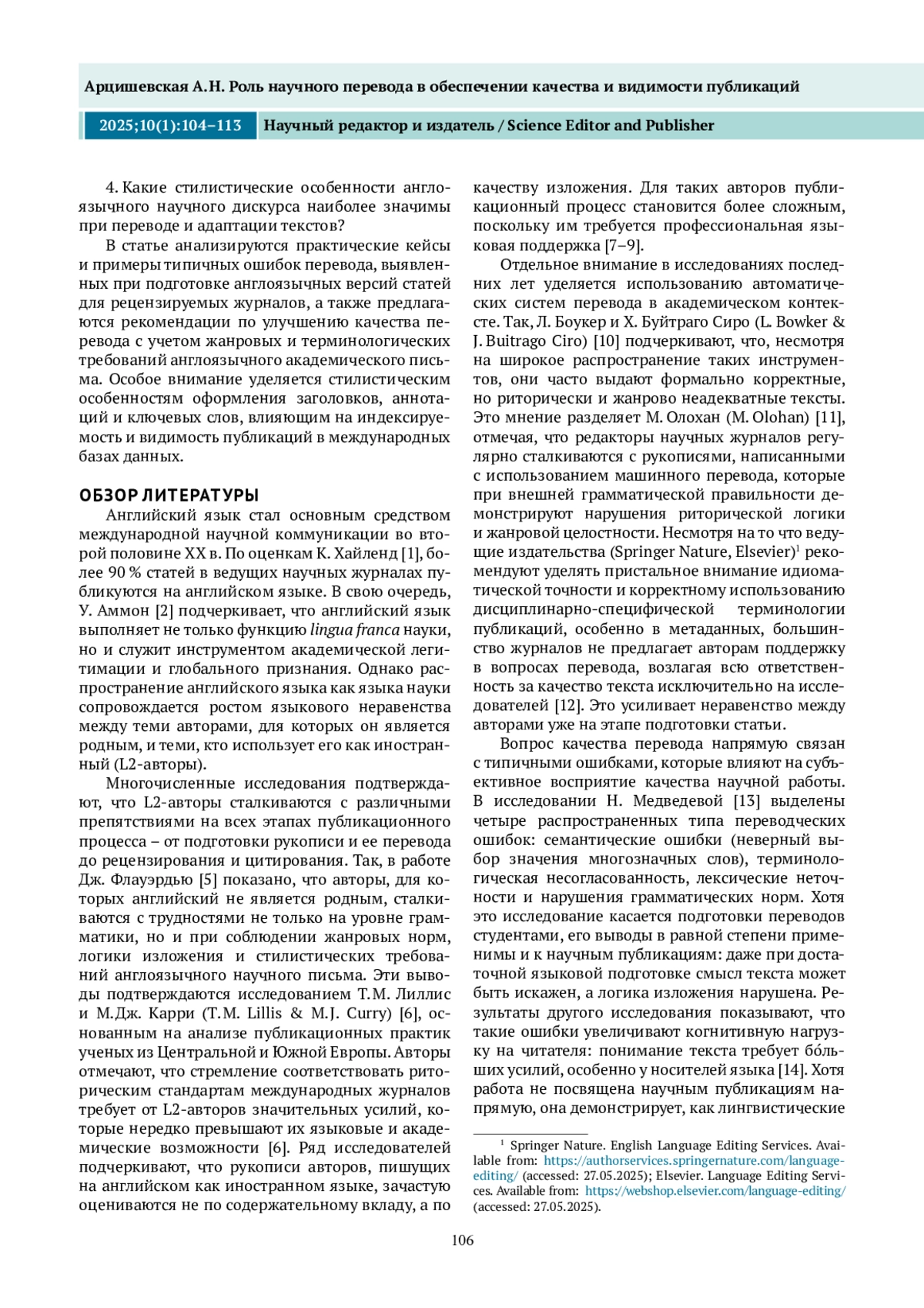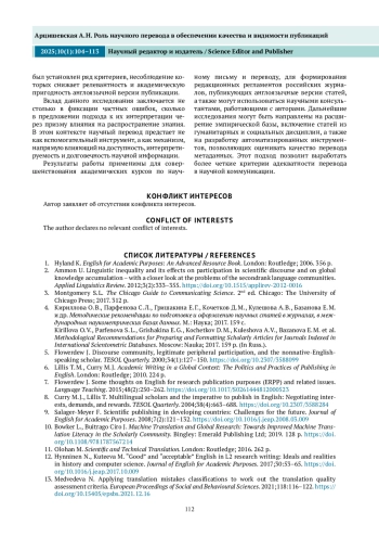 В последние десятилетия английский язык окончательно утвердился в роли основного средства научной коммуникации, выполняя функции универсального медиатора между академическими сообществами разных стран. По оценкам исследователей, более 90 % публикаций в международных научных журналах выходят на английском языке, причем значительная их часть написана авторами, для которых он не является родным [1]. Такая языковая асимметрия создает как новые возможности (расширение научной видимости, повышение цитируемости, участие в глобальных проектах), так и серьезные вызовы, особенно на этапе подготовки и представления рукописей к международной публикации.