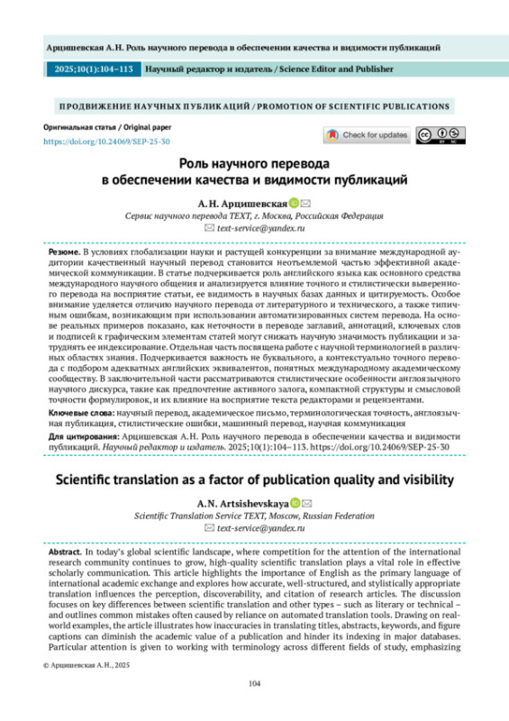 В условиях глобализации науки и растущей конкуренции за внимание международной аудитории качественный научный перевод становится неотъемлемой частью эффективной академической коммуникации. В статье подчеркивается роль английского языка как основного средства международного научного общения и анализируется влияние точного и стилистически выверенного перевода на восприятие статьи, ее видимость в научных базах данных и цитируемость. Особое внимание уделяется отличию научного перевода от литературного и технического, а также типичным ошибкам, возникающим при использовании автоматизированных систем перевода. На основе реальных примеров показано, как неточности в переводе заглавий, аннотаций, ключевых слов и подписей к графическим элементам статей могут снижать научную значимость публикации и затруднять ее индексирование. Отдельная часть посвящена работе с научной терминологией в различных областях знания. Подчеркивается важность не буквального, а контекстуально точного перевода с подбором адекватных английских эквивалентов, понятных международному академическому сообществу. В заключительной части рассматриваются стилистические особенности англоязычного научного дискурса, такие как предпочтение активного залога, компактной структуры и смысловой точности формулировок, и их влияние на восприятие текста редакторами и рецензентами.