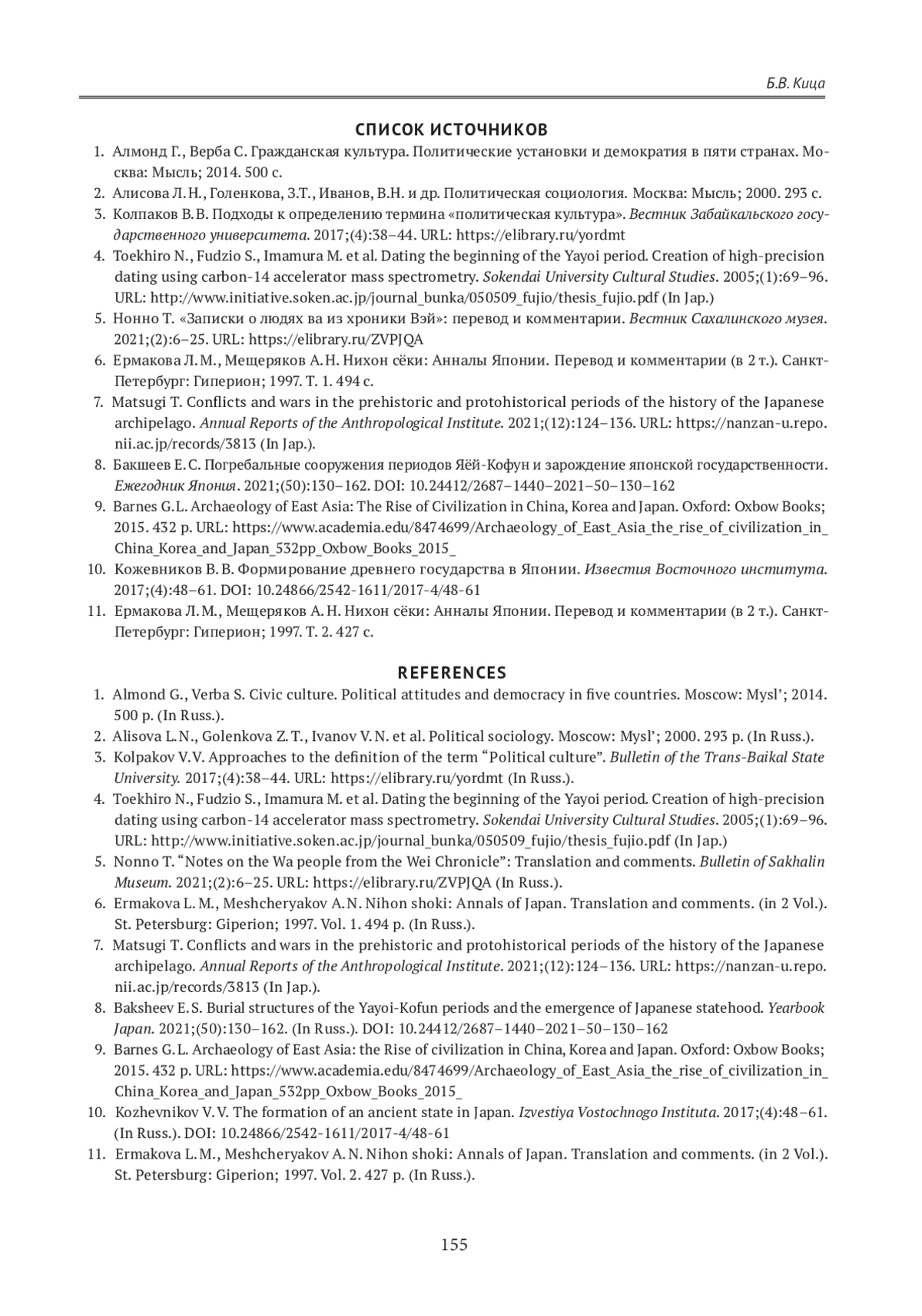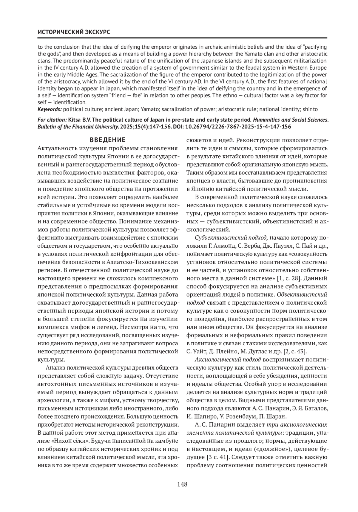 КИЦА Б. В. ПОЛИТИЧЕСКАЯ КУЛЬТУРА ЯПОНИИ В ДОГОСУДАРСТВЕННЫЙ И РАННЕГОСУДАРСТВЕННЫЙ ПЕРИОД // ГУМАНИТАРНЫЕ НАУКИ. ВЕСТНИК ФИНАНСОВОГО УНИВЕРСИТЕТА. 2025. ТОМ 15, № 4