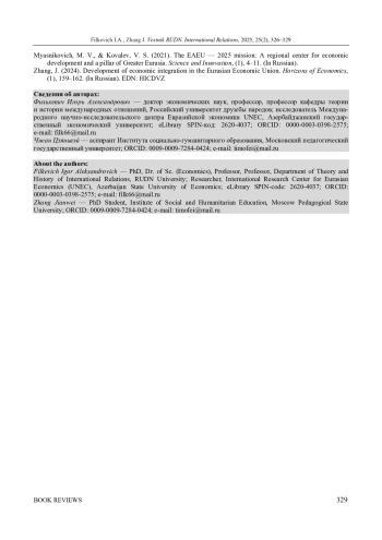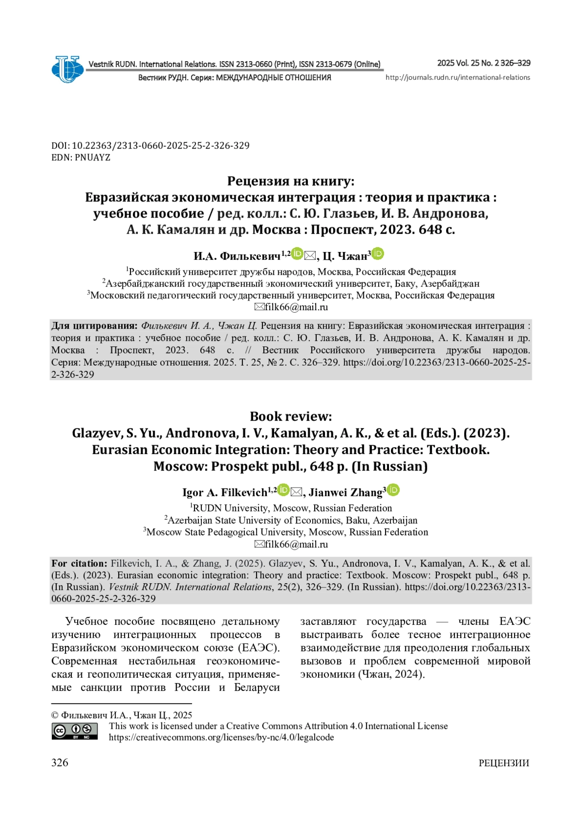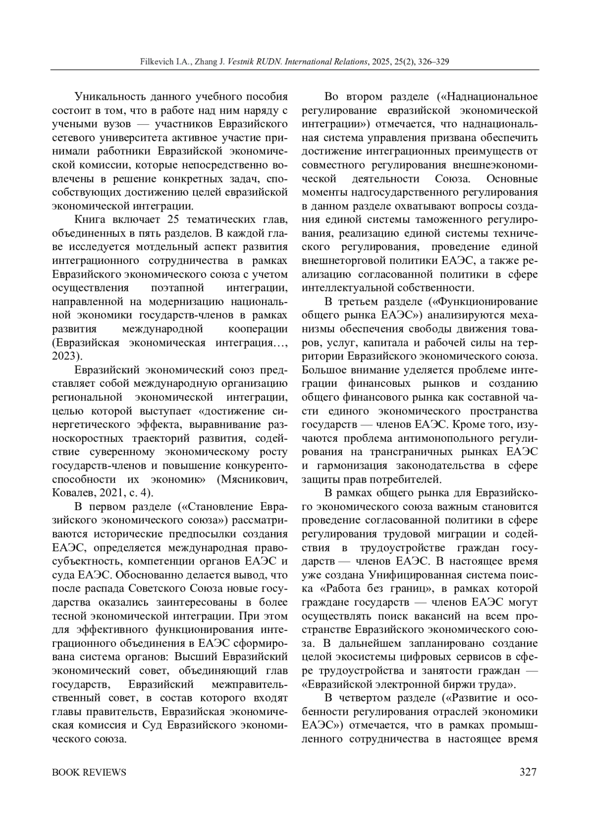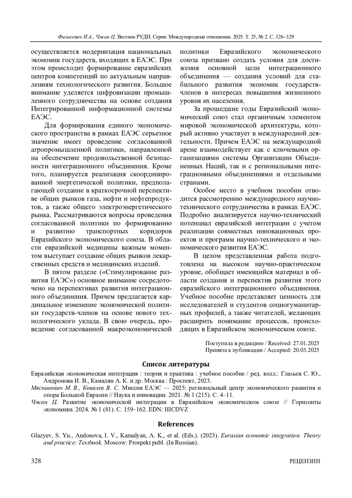 Для цитирования: Филькевич И. А., Чжан Ц. Рецензия на книгу: Евразийская экономическая интеграция: теория и практика: учебное пособие / ред. колл.: С. Ю. Глазьев, И. В. Андронова, А. К. Камалян и др. Москва: Проспект, 2023. 648 с. // Вестник Российского университета дружбы народов. Серия: Международные отношения. 2025. Т. 25, № 2. С. 326–329. https://doi. org/10.22363/2313-0660-2025-25 2-326-329