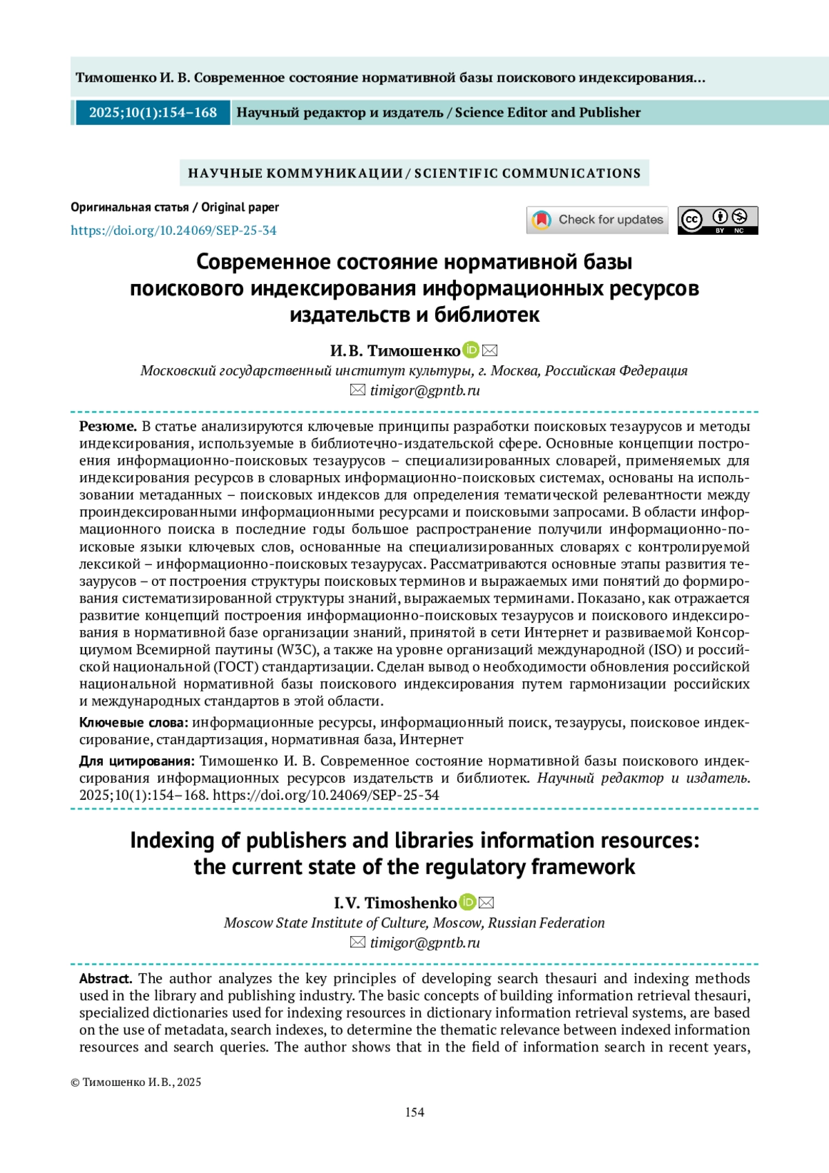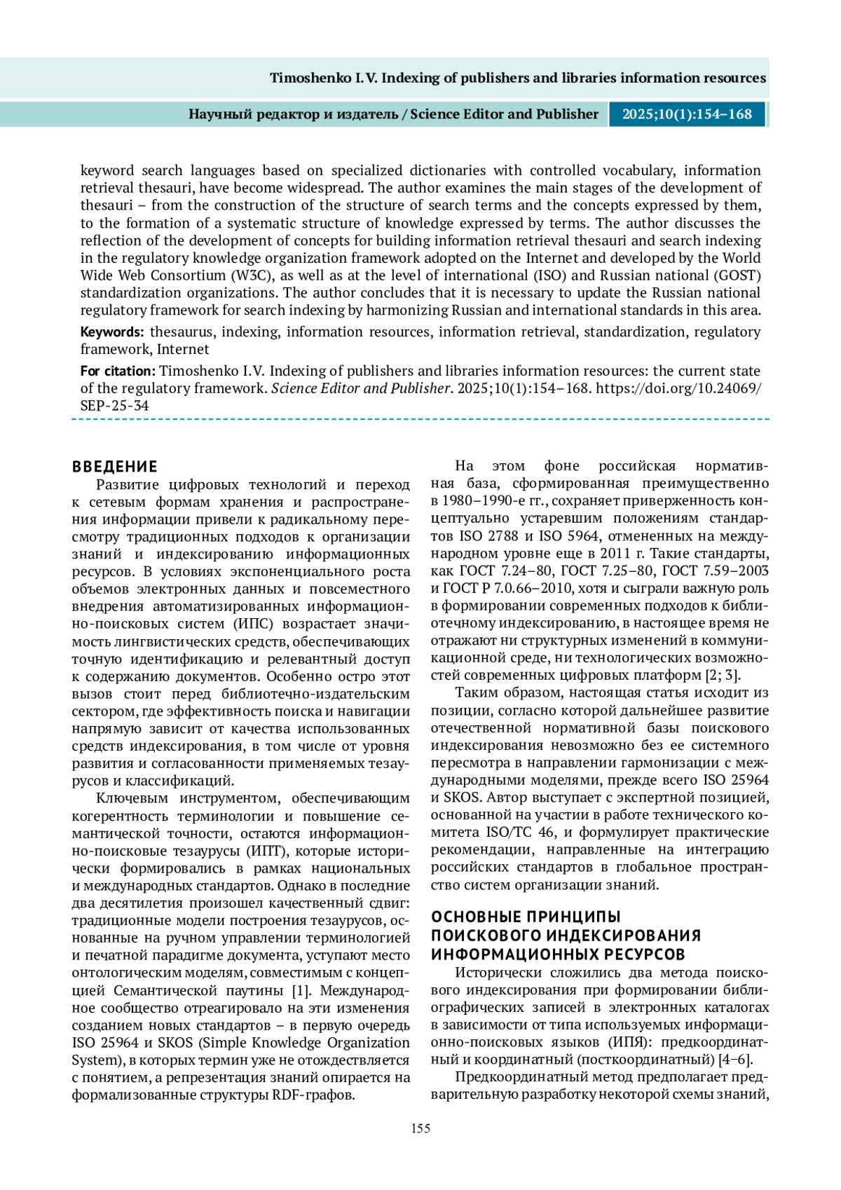 2. Тимошенко И. В. Современные тенденции развития методов и нормативной базы индексирования библиотечных информационных ресурсов. Научные и технические библиотеки. 2024;(10):102-122. DOI: 10.33186/1027-3689-2024-10-102-122