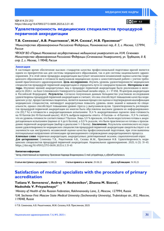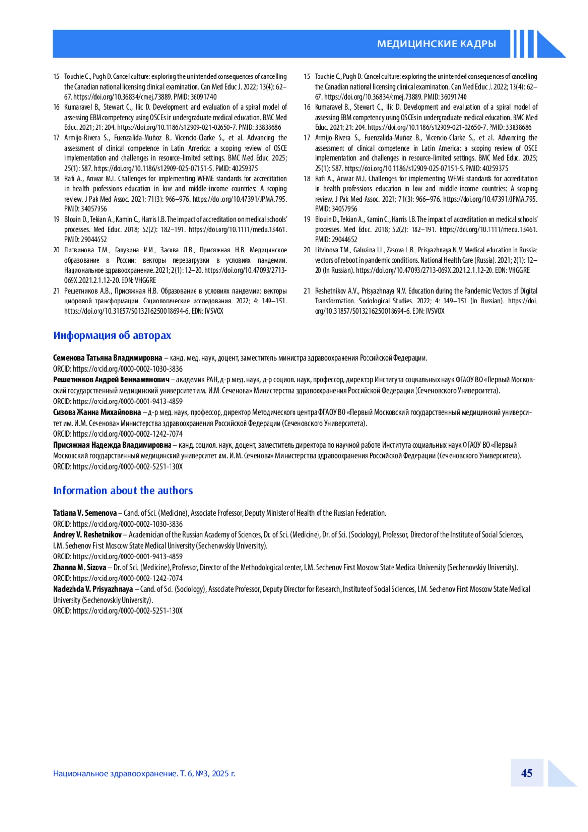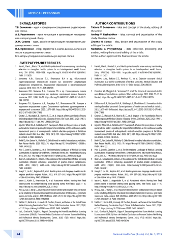 20. Литвинова Т.М., Галузина И.И., Засова Л.B., Присяжная Н.В. Медицинское образование в России: векторы перезагрузки в условиях пандемии. Национальное здравоохранение. 2021; 2(1): 12-20. DOI: 10.47093/2713-069X.2021.2.1.12-20