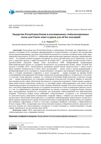 Цель исследования - анализ опыта и уроков формирования и функционирования ad hoc коалиции из «второстепенных» государств, выполняющей стабилизационные задачи в условиях внутреннего конфликта, и роли государства - лидера коалиции на примере Кении в изменяющейся международной обстановке посредством междисциплинарного, исторического и системного подходов. Автор приходит к выводу, что готовность Республики Кения выступить в качестве государства - лидера коалиционных сил показывает расширение возможностей государств Африки по выполнению ведущих ролей в сфере обеспечения безопасности за пределами континента. Однако процесс развертывания новой миссии существенно затянулся, и в настоящее время стабилизационные силы имеют весьма ограниченные ресурсы и возможности в плане помощи гаитянской полиции. Результаты анализа опыта первого этапа Многонациональной миссии по поддержке безопасности в Гаити подтверждают рабочую гипотезу о том, что эффективность действий коалиционных сил связана с наличием государства-лидера, обладающего международным авторитетом и ресурсами для проведения стабилизационной или миротворческой операции. Отмечается разрыв между амбициями «второстепенных» государств и их возможностями по самостоятельному проведению коалиционных операций. Наряду с общими для аналогичных операций трудностями в обеспечении прогнозируемого и устойчивого финансирования данная миссия столкнулась с рядом проблем национального уровня, включая необходимость формирования правовой базы для направления кенийских миротворцев в Гаити и отсутствие поддержки кенийских оппозиции и общественности. В свою очередь США, поддерживая свои геополитические интересы в Карибском регионе, продолжают играть роль патрона для «несостоявшихся государств» и создают коалиции со «второстепенными» государствами, привлекая их для достижения своих целей.