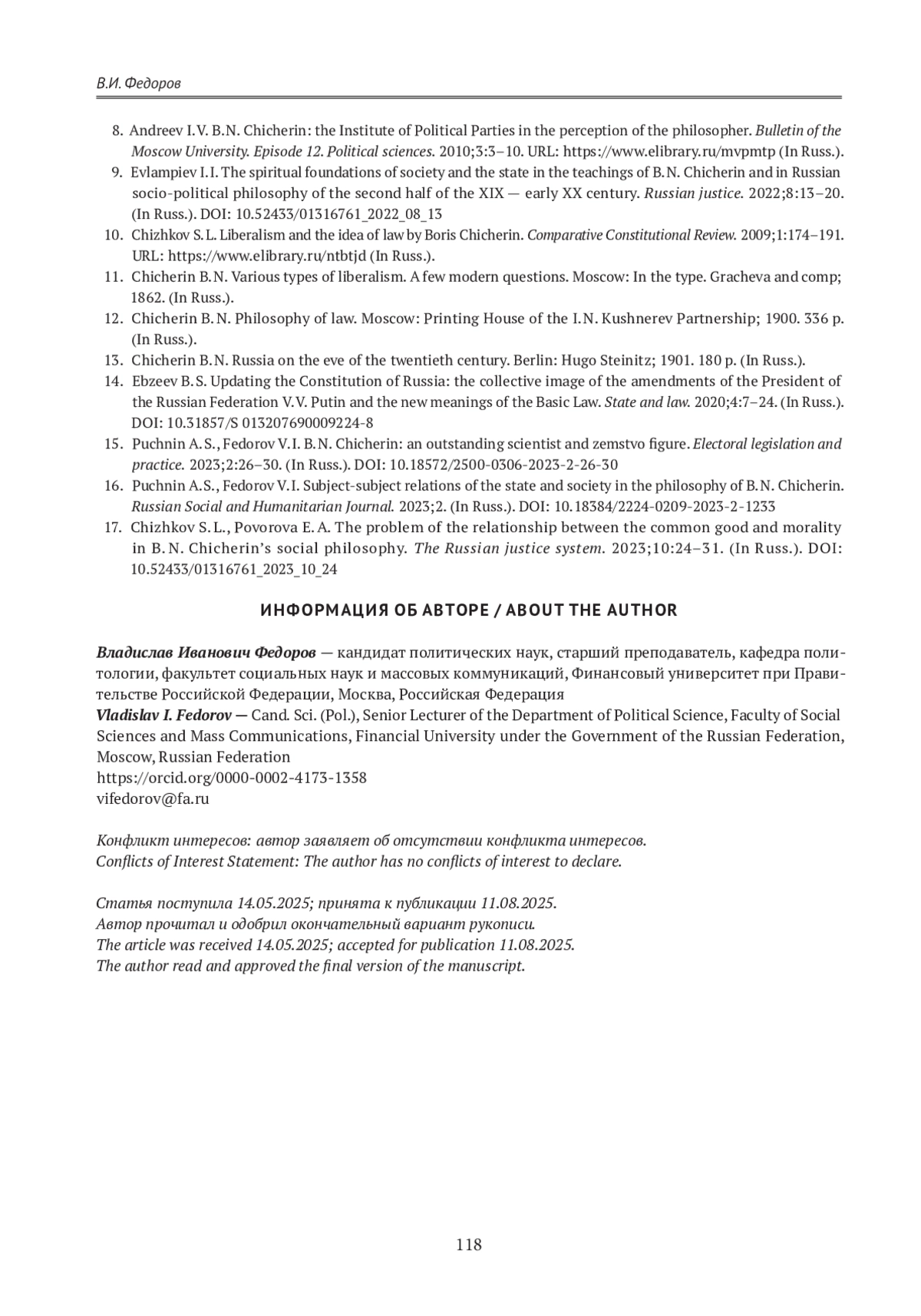 16. Пучнин А. С., Федоров В. И. Субъект-субъектные отношения государства и общества в философии Б. Н. Чичерина. Российский социально-гуманитарный журнал. 2023;2. https://doi.org/10.18384/2224-0209-2023-2-1233