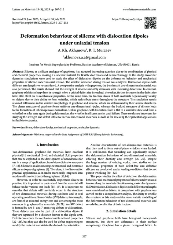 24. A. K. Akhunova, R. T. Murzaev, J. A. Baimova, Graphene with dislocation dipoles: Wrinkling and defect nucleation during tension, Computational Materials Science 244 (2024) 113230. DOI: 10.1016/j.commatsci.2024.113230