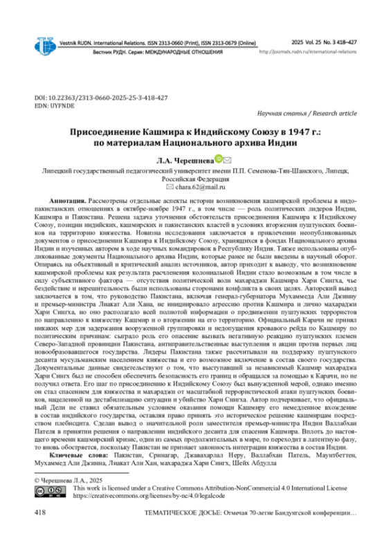 CHERESHNEVA L. A. ПРИСОЕДИНЕНИЕ КАШМИРА К ИНДИЙСКОМУ СОЮЗУ В 1947 Г.: ПО МАТЕРИАЛАМ НАЦИОНАЛЬНОГО АРХИВА ИНДИИ // ВЕСТНИК РОССИЙСКОГО УНИВЕРСИТЕТА ДРУЖБЫ НАРОДОВ. СЕРИЯ: МЕЖДУНАРОДНЫЕ ОТНОШЕНИЯ. 2025. ТОМ 25 № 3