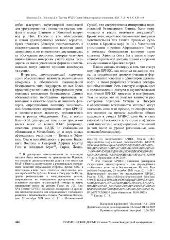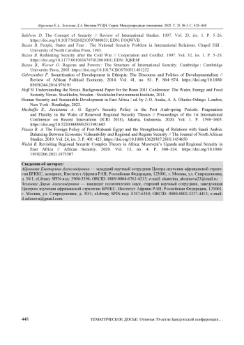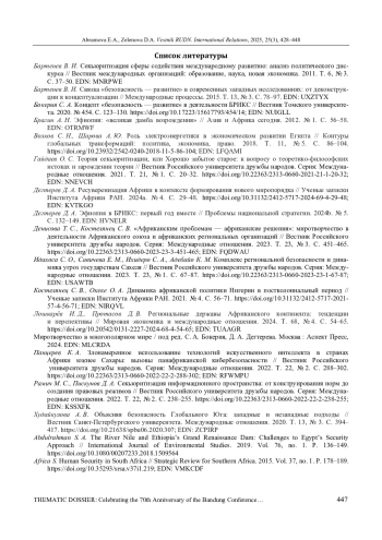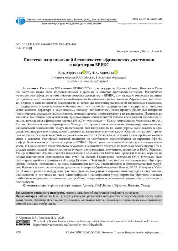 АБРАМОВА Е. А., ЗЕЛЕНОВА Д. А. ПОВЕСТКА НАЦИОНАЛЬНОЙ БЕЗОПАСНОСТИ АФРИКАНСКИХ УЧАСТНИКОВ И ПАРТНЕРОВ БРИКС // ВЕСТНИК РОССИЙСКОГО УНИВЕРСИТЕТА ДРУЖБЫ НАРОДОВ. СЕРИЯ: МЕЖДУНАРОДНЫЕ ОТНОШЕНИЯ. 2025. ТОМ 25 № 3
