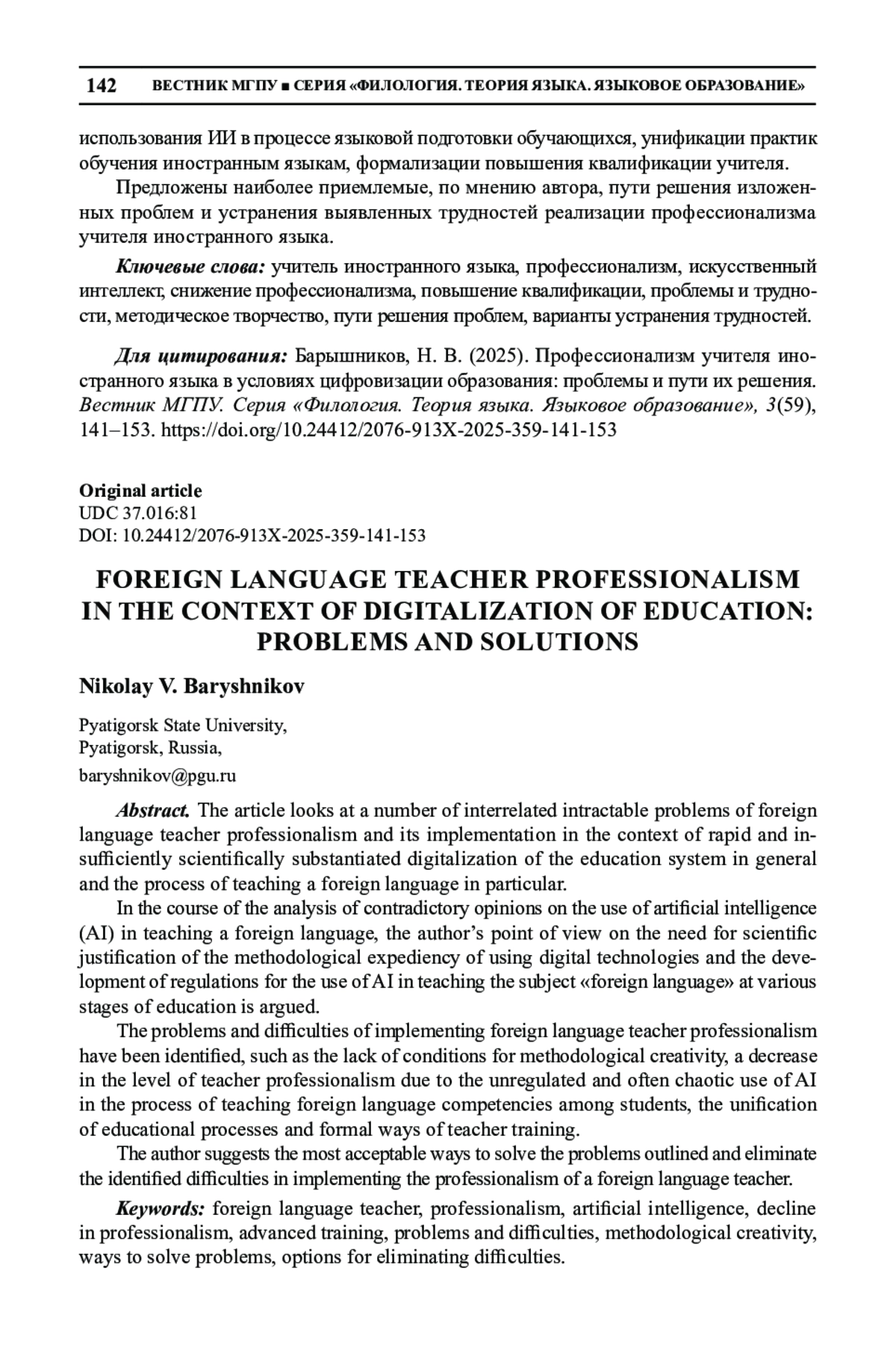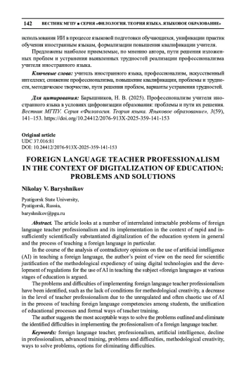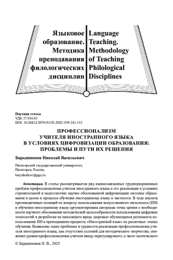 В статье рассматривается ряд взаимосвязанных трудноразрешимых проблем профессионализма учителя иностранного языка и его реализации в условиях стремительной и недостаточно научно обоснованной цифровизации системы образования в целом и процесса обучения иностранному языку в частности. В ходе анализа противоречивых позиций по вопросу использования искусственного интеллекта (ИИ) в обучении иностранному языку аргументирована авторская точка зрения о необходимости научного обоснования методической целесообразности использования цифровых технологий и разработки не наносящего вреда здоровью обучающихся регламента использования ИИ в преподавании предмета «Иностранный язык» на различных этапах обучения. Выявлены такие проблемы и трудности реализации профессионализма учителя иностранного языка, как отсутствие условий для методического творчества, снижение уровня профессионализма учителя ввиду нерегулируемого, а часто хаотического использования ИИ в процессе языковой подготовки обучающихся, унификации практик обучения иностранным языкам, формализации повышения квалификации учителя. Предложены наиболее приемлемые, по мнению автора, пути решения изложенных проблем и устранения выявленных трудностей реализации профессионализма учителя иностранного языка.