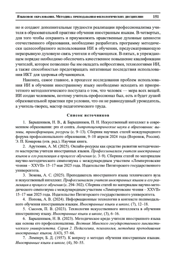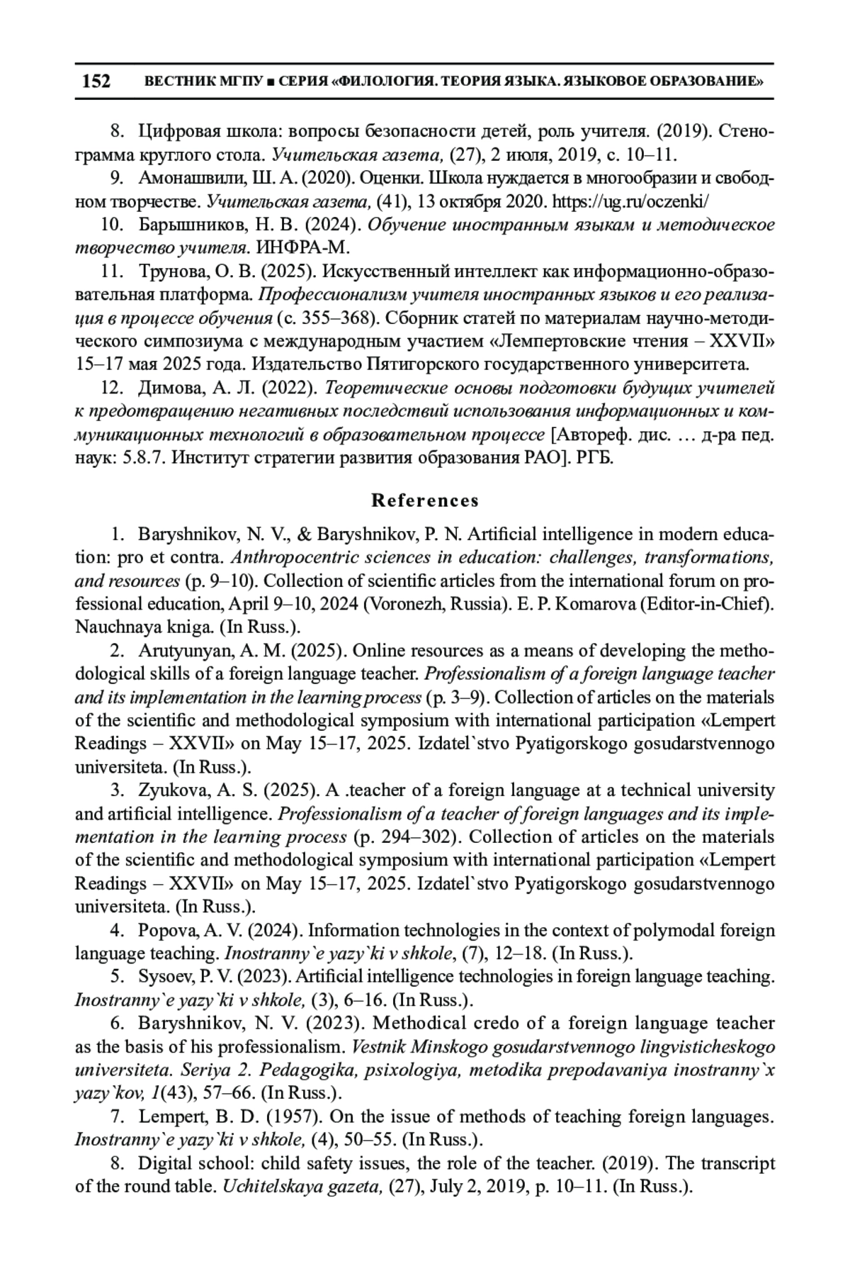 11. Трунова, О. В. (2025). Искусственный интеллект как информационно-образовательная платформа. Профессионализм учителя иностранных языков и его реализация в процессе обучения (с. 355-368). Сборник статей по материалам научно-методического симпозиума с международным участием “Лемпертовские чтения - XXVII” 15-17 мая 2025 года. Издательство Пятигорского государственного университета.