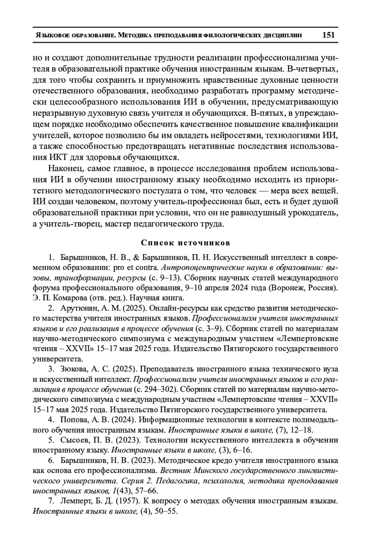 1. Барышников, Н. В., & Барышников, П. Н. Искусственный интеллект в современном образовании: pro et contra. Антропоцентрические науки в образовании: вызовы, трансформации, ресурсы (с. 9-13). Сборник научных статей международного форума профессионального образования, 9-10 апреля 2024 года (Воронеж, Россия). Э. П. Комарова (отв. ред.). Научная книга.