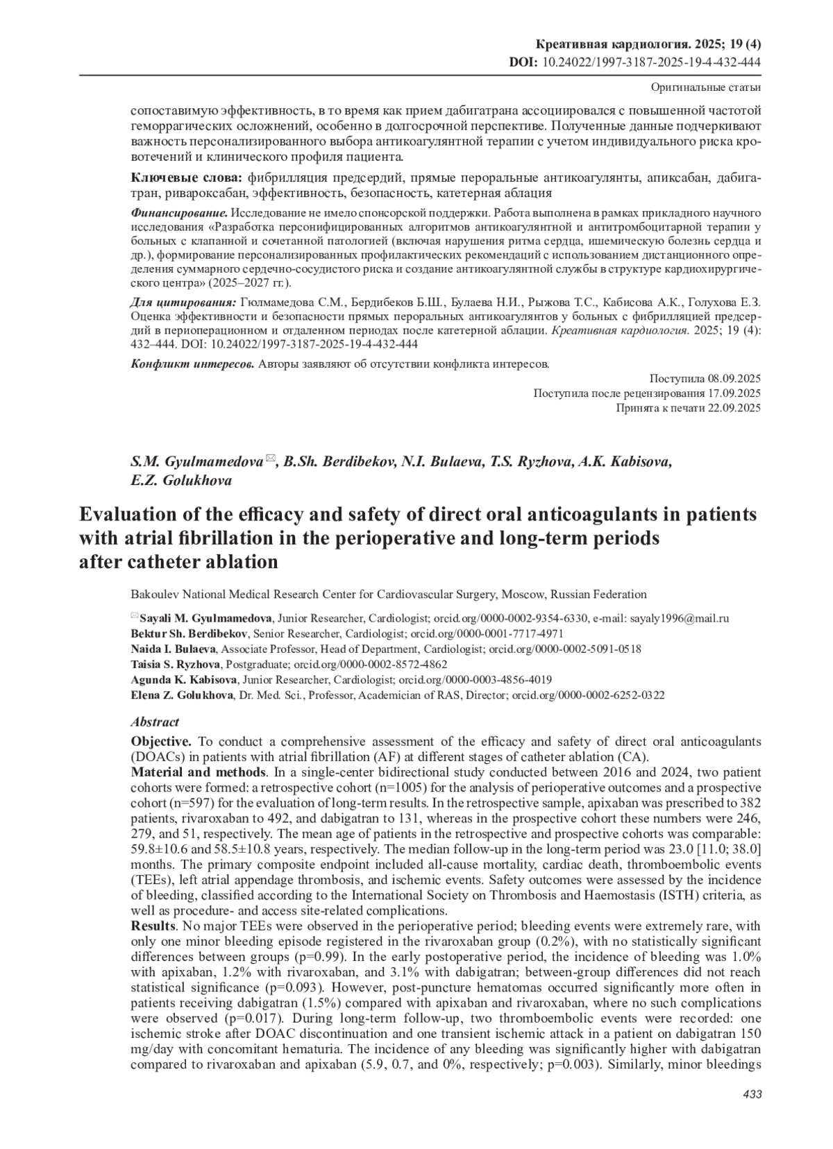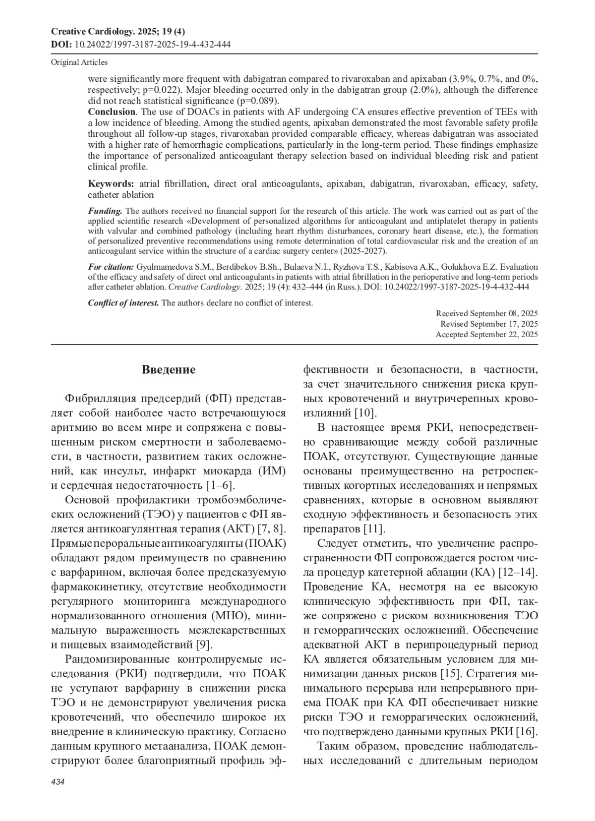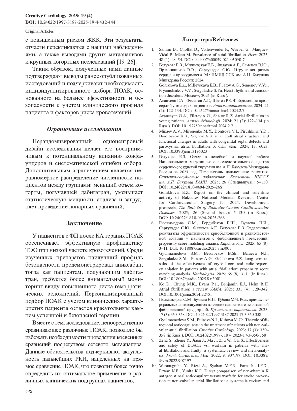 6. Гюлмамедова С.М., Бердибеков Б.Ш., Булаева Н.И., Сергуладзе С.Ю., Филатов А.Г., Голухова Е.З. Отдаленные результаты эффективности криобаллонной и радиочастотной аблации у пациентов с фибрилляцией предсердий: propensity score matching анализ. Кардиология. 2025; 65 (8): 3-11. DOI: 10.18087/cardio.2025.8.n3001
