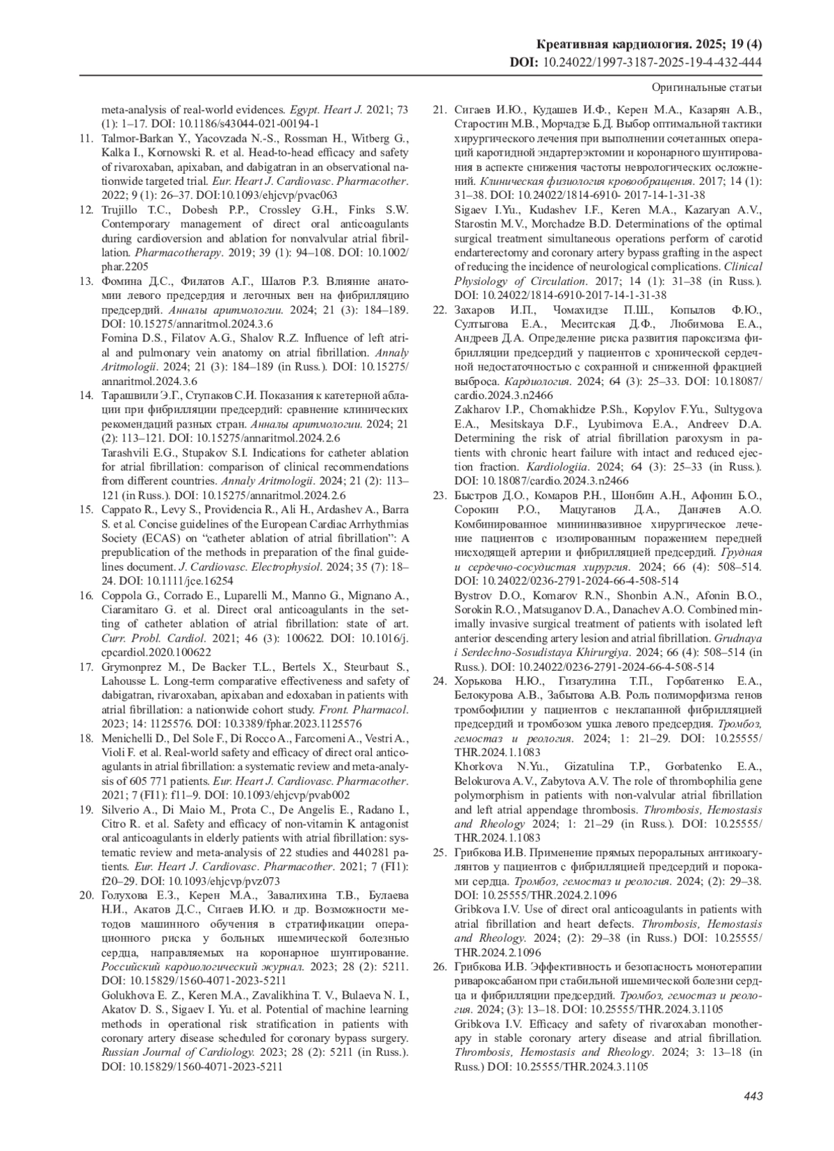 25. Грибкова И.В. Применение прямых пероральных антикоагулянтов у пациентов с фибрилляцией предсердий и пороками сердца. Тромбоз, гемостаз и реология. 2024; (2): 29-38. Gribkova I.V. Use of direct oral anticoagulants in patients with atrial fibrillation and heart defects. Throm. DOI: 10.25555/THR.2024.2.1096