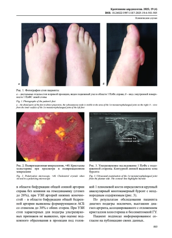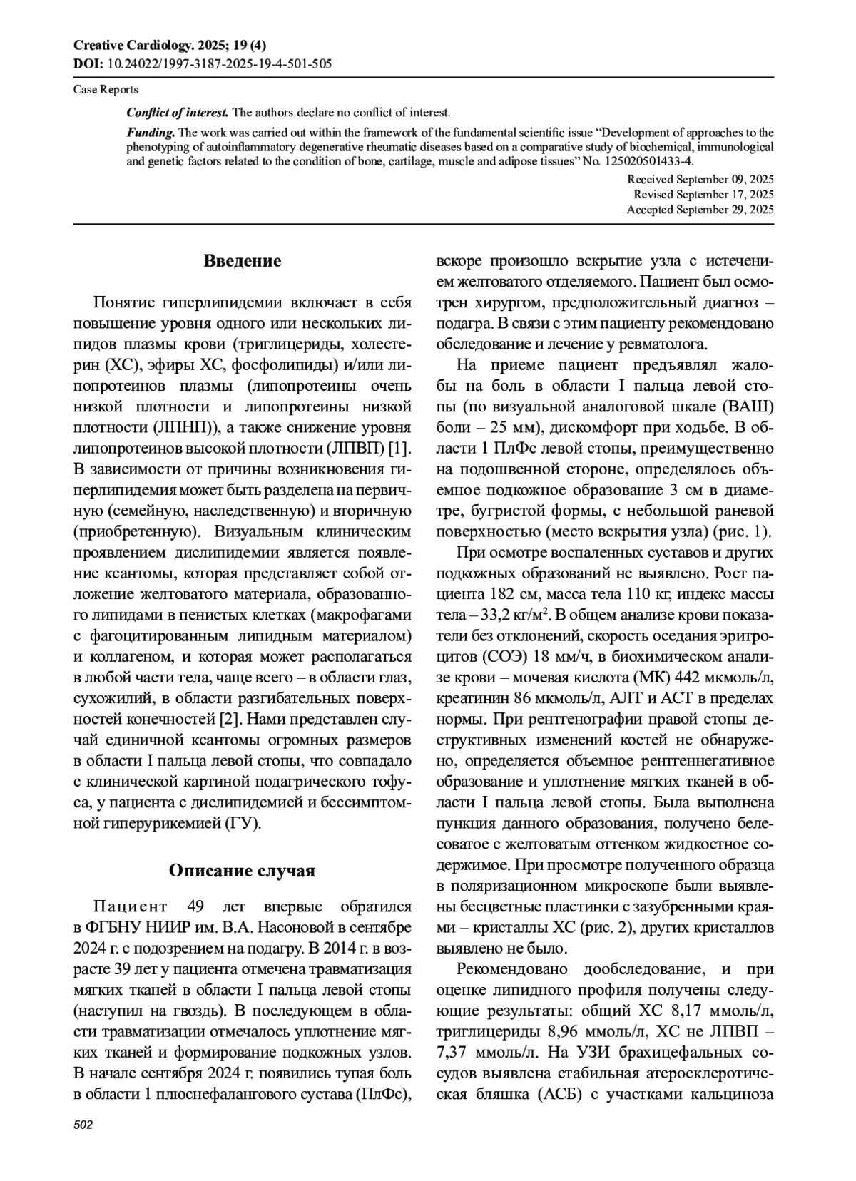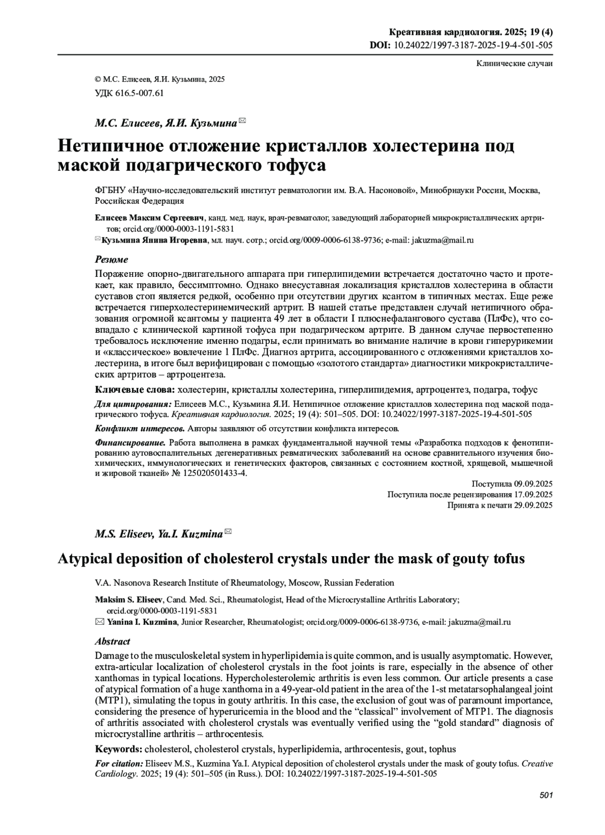 Поражение опорно-двигательного аппарата при гиперлипидемии встречается достаточно часто и протекает, как правило, бессимптомно. Однако внесуставная локализация кристаллов холестерина в области суставов стоп является редкой, особенно при отсутствии других ксантом в типичных местах. Еще реже встречается гиперхолестеринемический артрит. В нашей статье представлен случай нетипичного образования огромной ксантомы у пациента 49 лет в области I плюснефалангового сустава (ПлФс), что совпадало с клинической картиной тофуса при подагрическом артрите. В данном случае первостепенно требовалось исключение именно подагры, если принимать во внимание наличие в крови гиперурикемии и «классическое» вовлечение 1 ПлФс. Диагноз артрита, ассоциированного с отложениями кристаллов холестерина, в итоге был верифицирован с помощью «золотого стандарта» диагностики микрокристаллических артритов – артроцентеза.