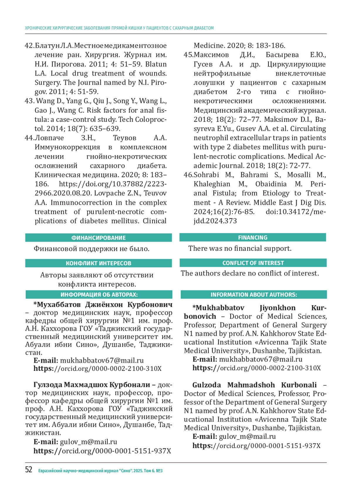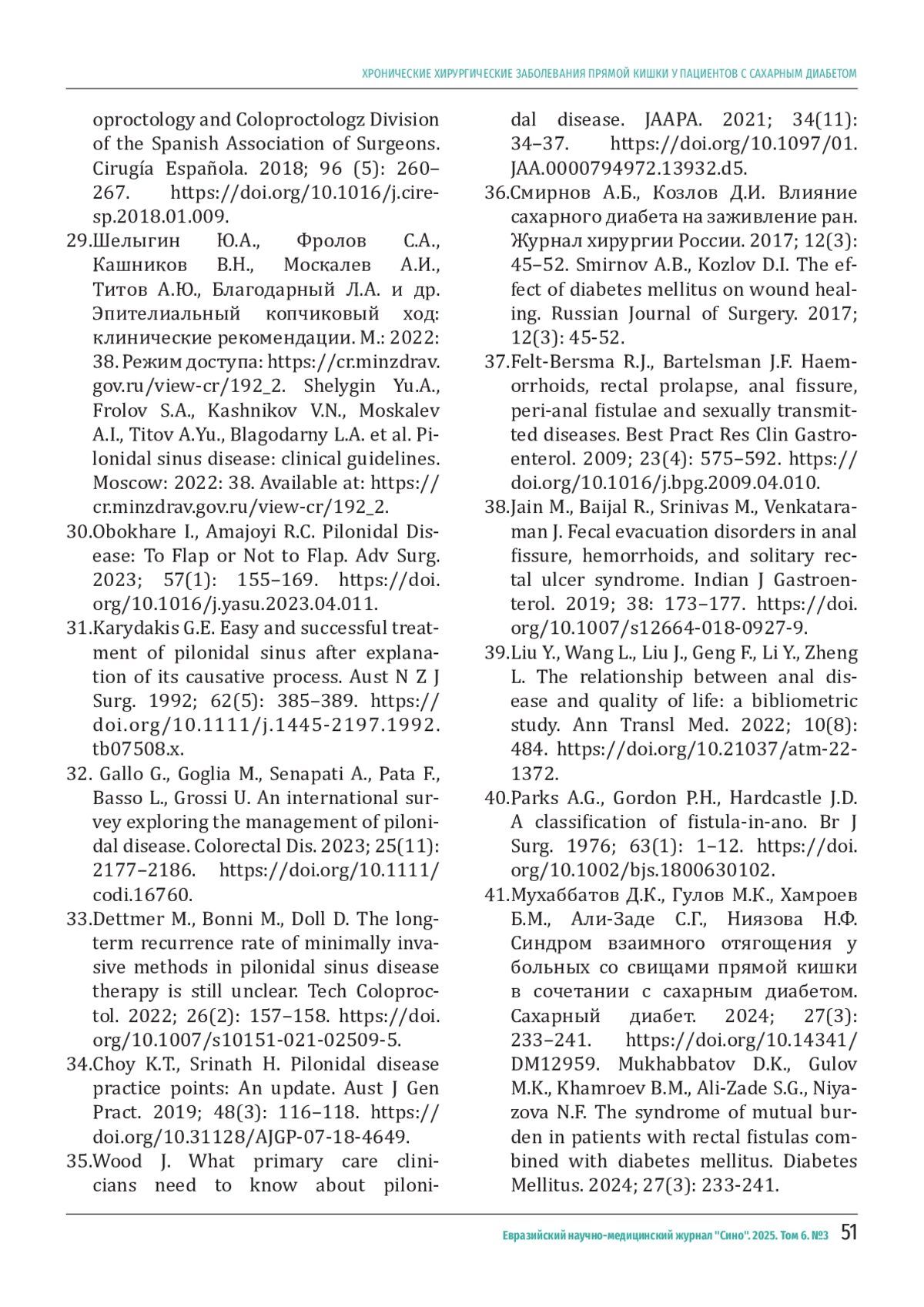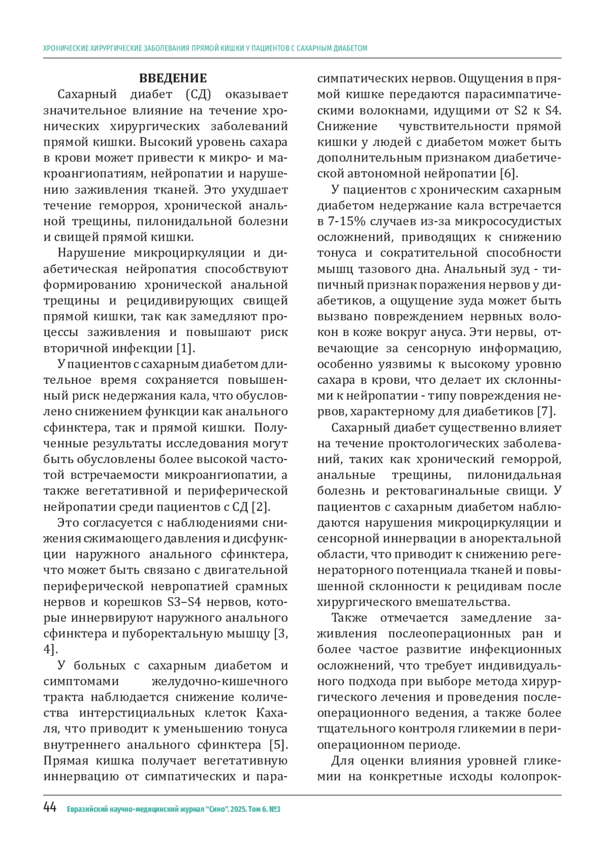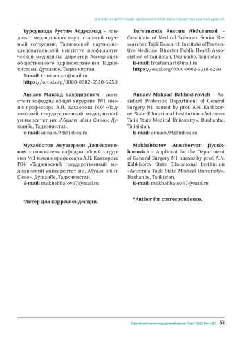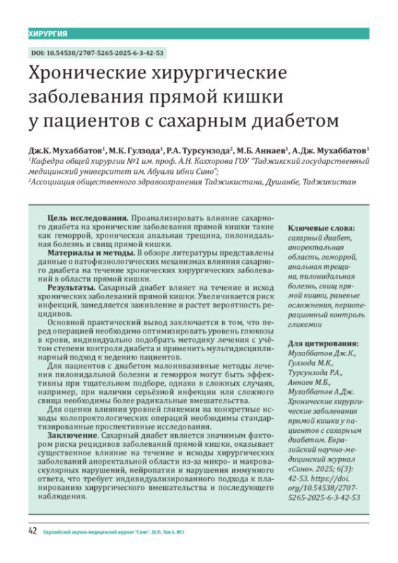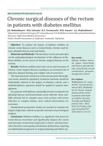 МУХАББАТОВ Д. К., ГУЛЗОДА М. К., ТУРСУНЗОДА Р. А., АННАЕВ М. Б., МУХАББАТОВ А. Д. ХРОНИЧЕСКИЕ ХИРУРГИЧЕСКИЕ ЗАБОЛЕВАНИЯ ПРЯМОЙ КИШКИ У ПАЦИЕНТОВ С САХАРНЫМ ДИАБЕТОМ // ЕВРАЗИЙСКИЙ НАУЧНО-МЕДИЦИНСКИЙ ЖУРНАЛ "СИНО". 2025. № 3, ТОМ 6