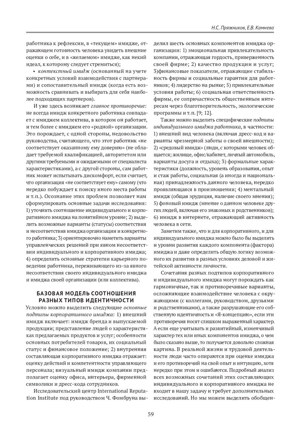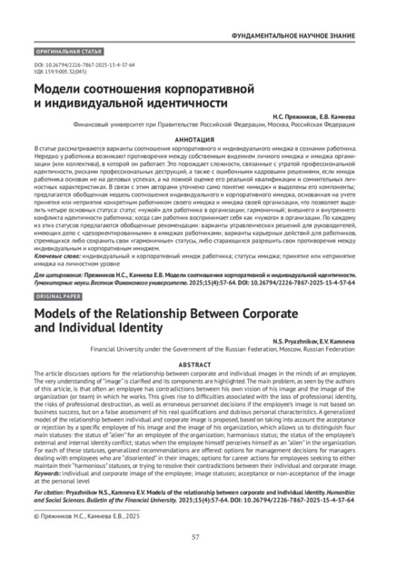В статье рассматриваются варианты соотношения корпоративного и индивидуального имиджа в сознании работника. Нередко у работника возникают противоречия между собственным видением личного имиджа и имиджа организации (или коллектива), в которой он работает. Это порождает сложности, связанные с утратой профессиональной идентичности, рисками профессиональных деструкций, а также с ошибочными кадровыми решениями, если имидж работника основан не на деловых успехах, а на ложной оценке его реальной квалификации и сомнительных личностных характеристиках. В связи с этим авторами уточнено само понятие «имидж» и выделены его компоненты; предлагается обобщенная модель соотношения индивидуального и корпоративного имиджа, основанная на учете принятия или неприятия конкретным работником своего имиджа и имиджа своей организации, что позволяет выделить четыре основных статуса: статус «чужой» для работника в организации; гармоничный; внешнего и внутреннего конфликта идентичности работника; когда сам работник воспринимает себя как «чужого» в организации. По каждому из этих статусов предлагаются обобщенные рекомендации: варианты управленческих решений для руководителей, имеющих дело с «дезориентированными» в имиджах работниками; варианты карьерных действий для работников, стремящихся либо сохранить свои «гармоничные» статусы, либо старающихся разрешить свои противоречия между индивидуальным и корпоративным имиджем.