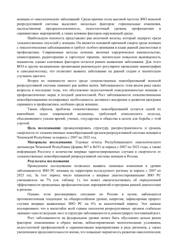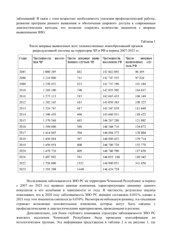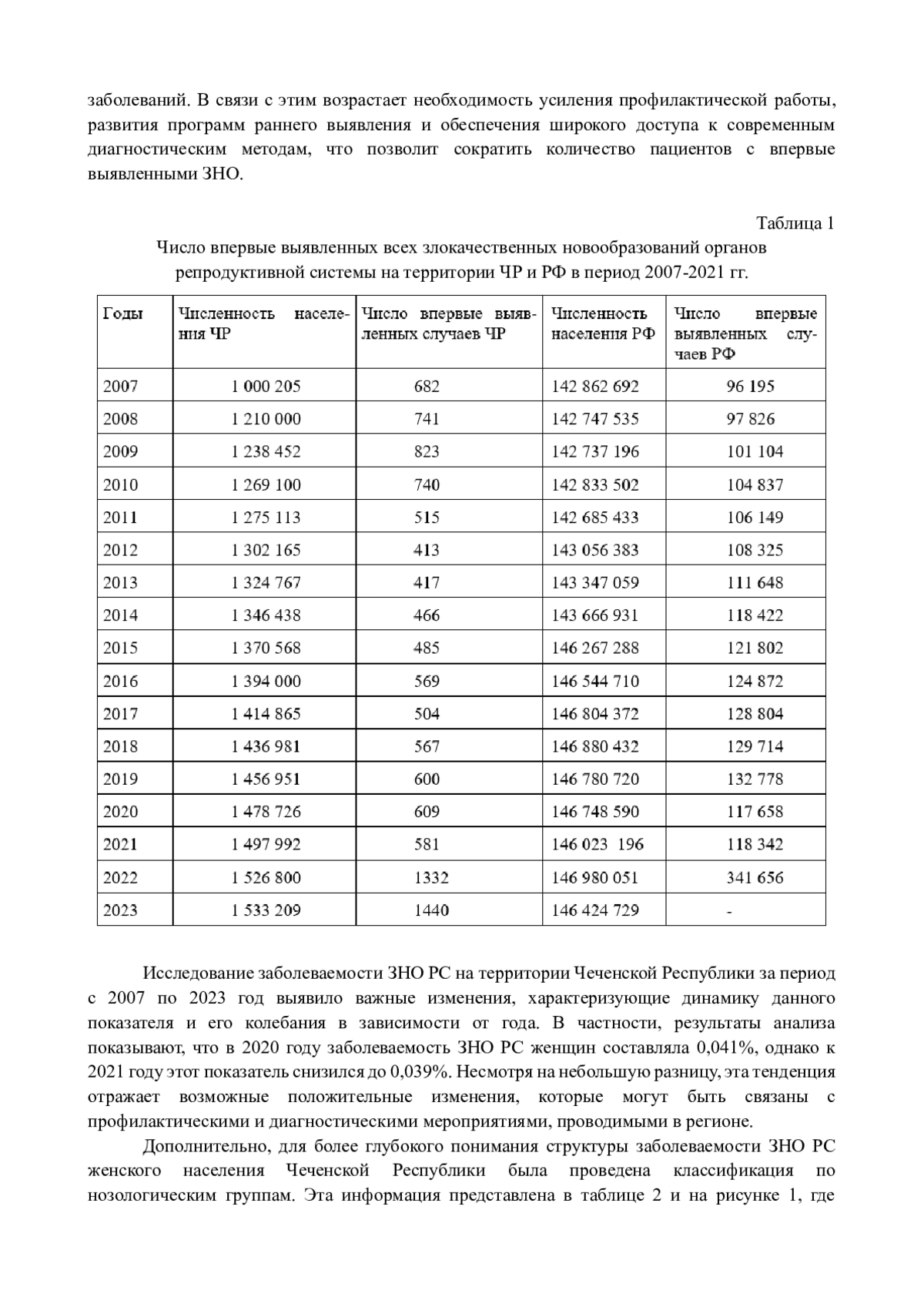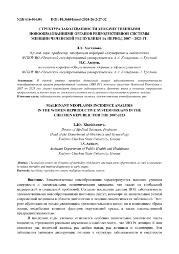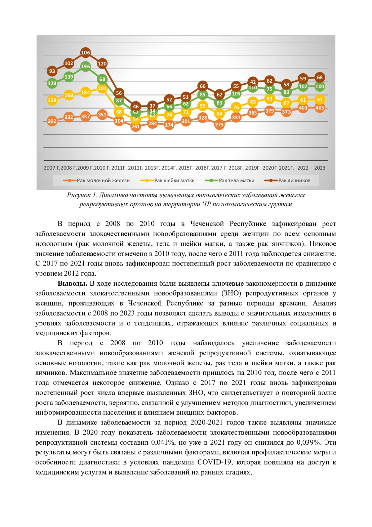 В данной статье проведен детальный анализ заболеваемости злокачественными новообразованиями органов репродуктивной системы (ЗНО РС) женского населения Чеченской Республики с 2007 по 2023 год. Анализ охватывает динамику заболеваемости, факторы риска и основные направления профилактики, а также меры по снижению смертности и улучшению диагностики на ранних стадиях.