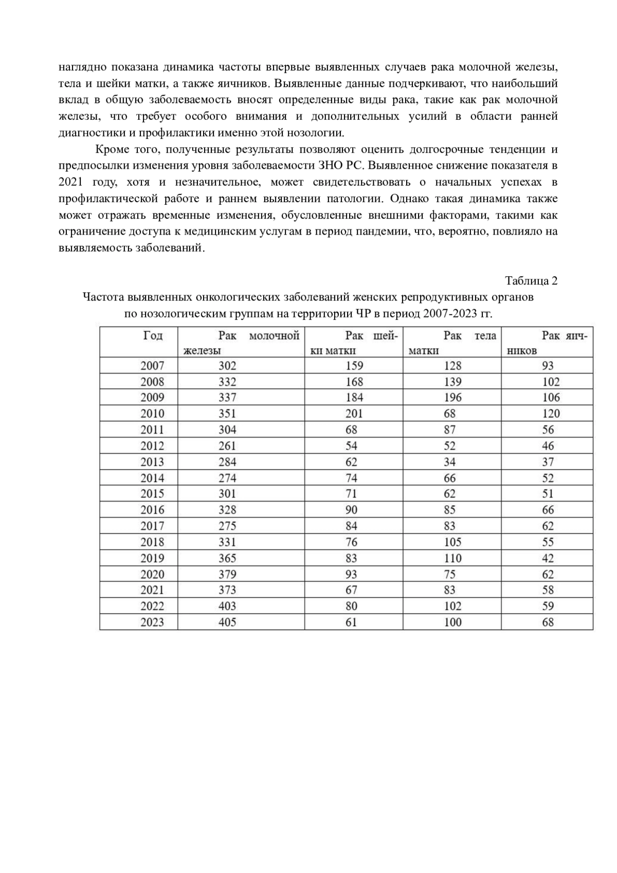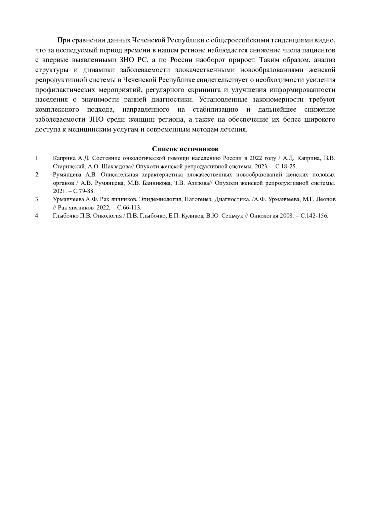 1. Каприна А.Д. Состояние онкологической помощи населению России в 2022 году / А.Д. Каприна, В.В. Старинский, А.О. Шахзадова// Опухоли женской репродуктивной системы. 2023. - С.18-25.