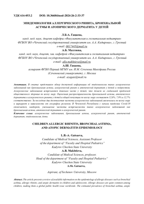 ГАЦАЕВА А. Ш., ГАЦАЕВА Л. Б., МАХТИЕВА А. Б. ЭПИДЕМИОЛОГИЯ АЛЛЕРГИЧЕСКОГО РИНИТА, БРОНХИАЛЬНОЙ АСТМЫ И АТОПИЧЕСКОГО ДЕРМАТИТА У ДЕТЕЙ // ВЕСТНИК МЕДИЦИНСКОГО ИНСТИТУТА. 2024. № 2 (26)