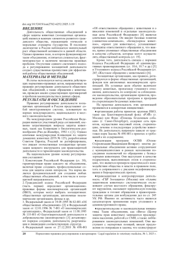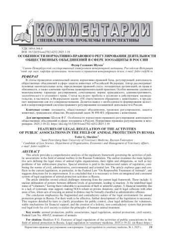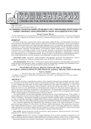 В статье проводится комплексный анализ нормативно-правовой базы, регулирующей деятельность общественных объединений в сфере защиты животных в Российской Федерации. Автор рассматривает основные законодательные акты, определяющие правовой статус зоозащитных организаций, их права и обязанности, а также ключевые проблемы правоприменительной практики. Особое внимание уделяется межотраслевому характеру регулирования, сочетающему нормы гражданского, административного, экологического и уголовного права. Статья исследует пробелы и коллизии в действующем законодательстве, в частности, в Федеральном законе «Об ответственном обращении с животными», и предлагает направления для его совершенствования. Делается вывод о необходимости формирования целостной и непротиворечивой системы правового регулирования зоозащитной деятельности в России.